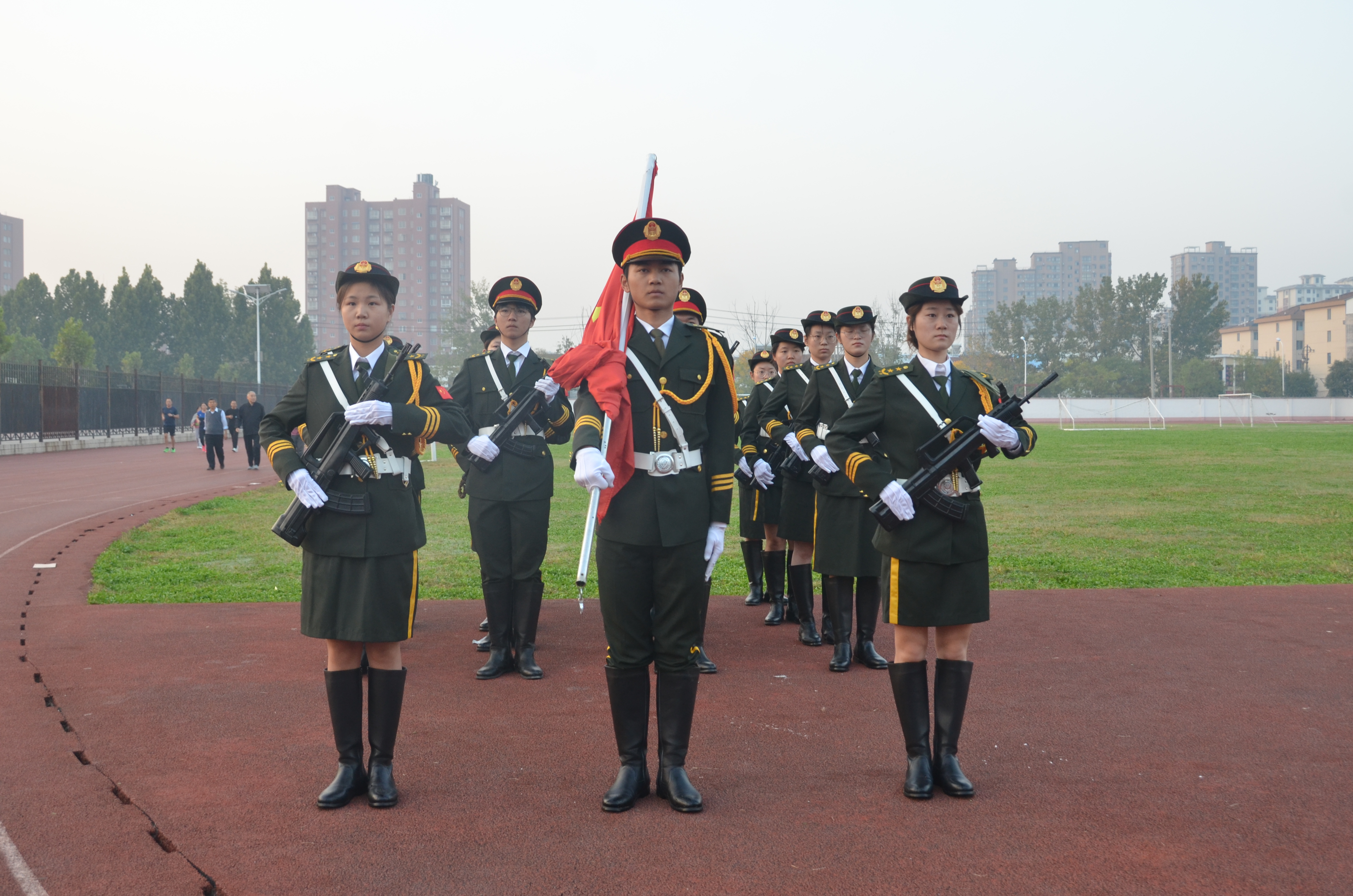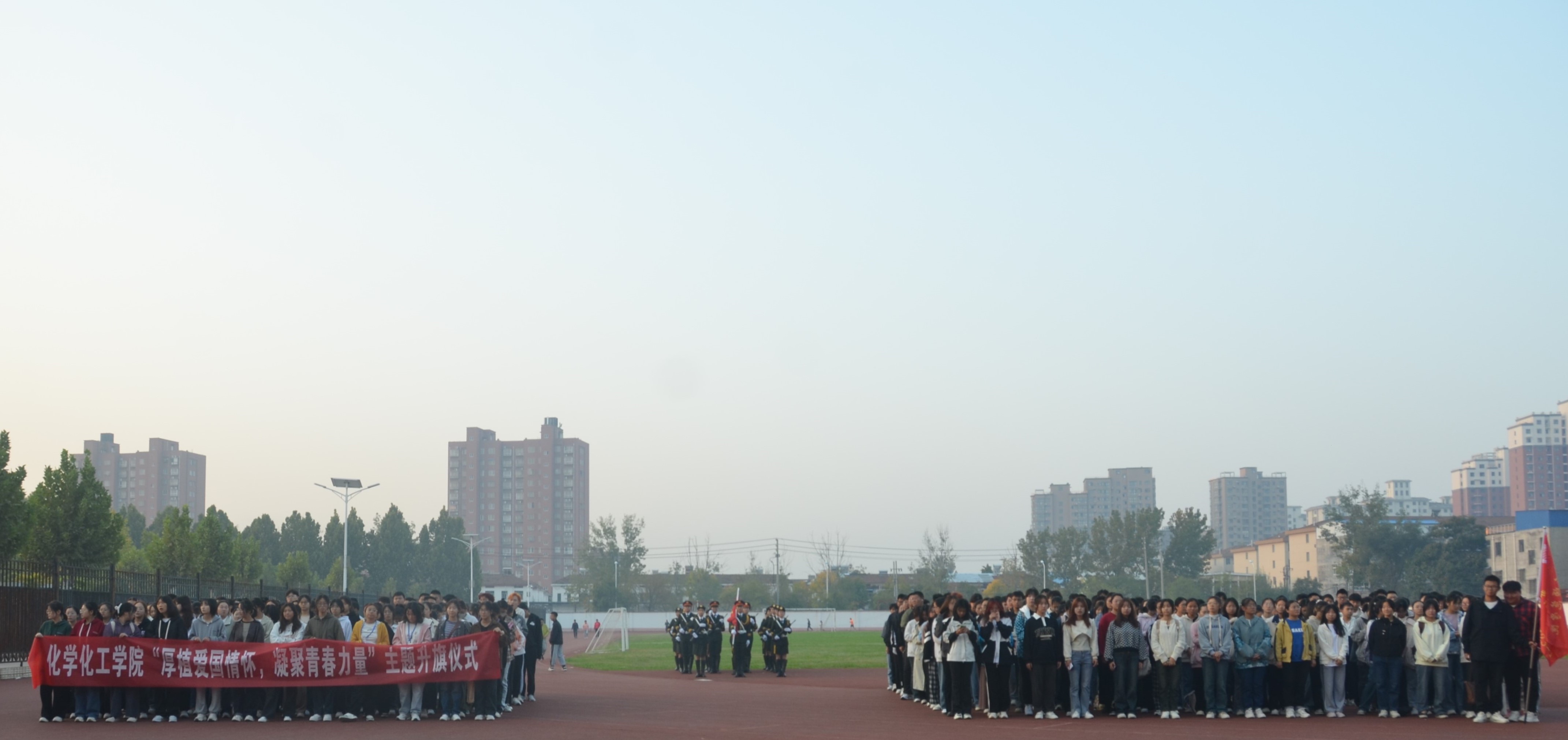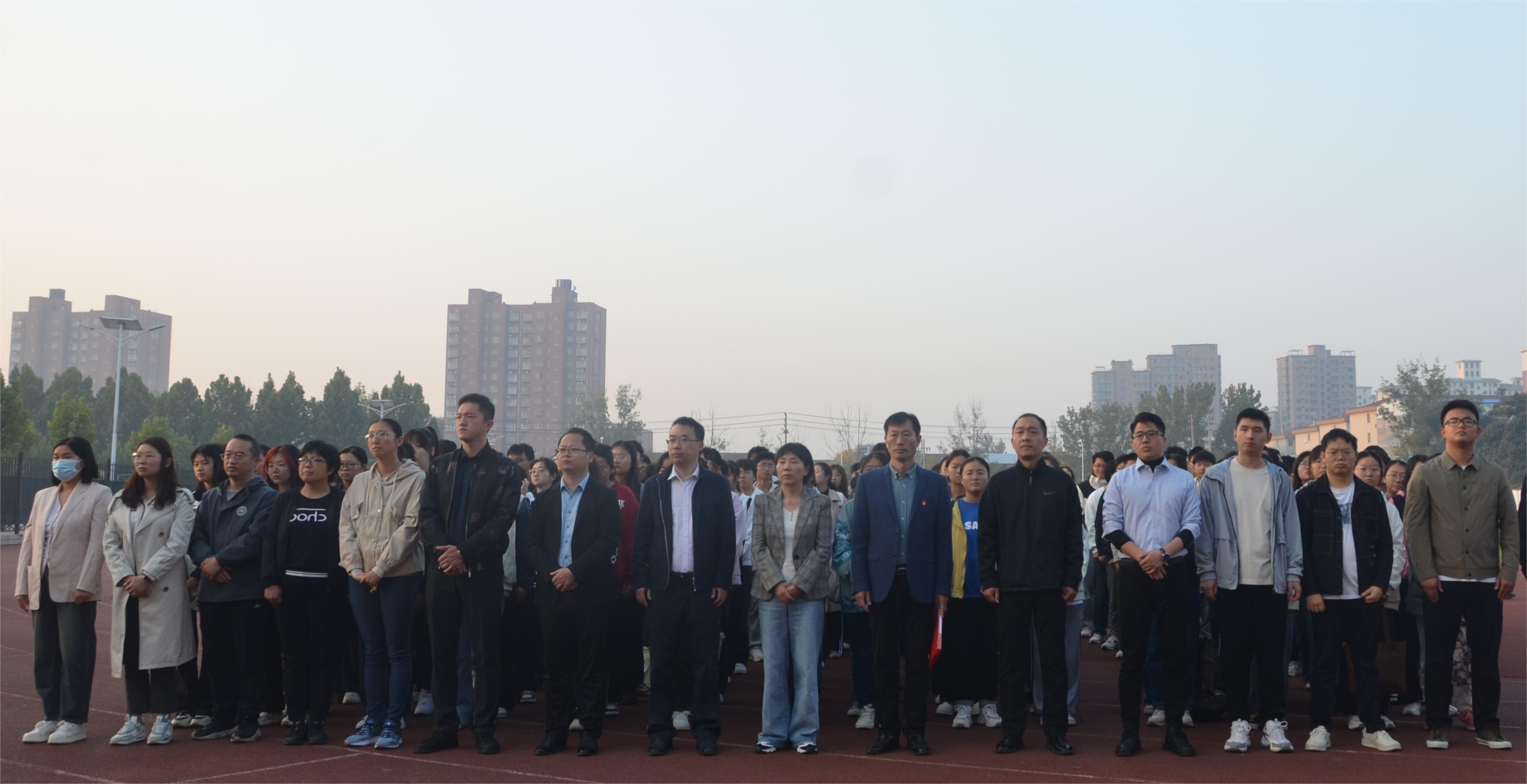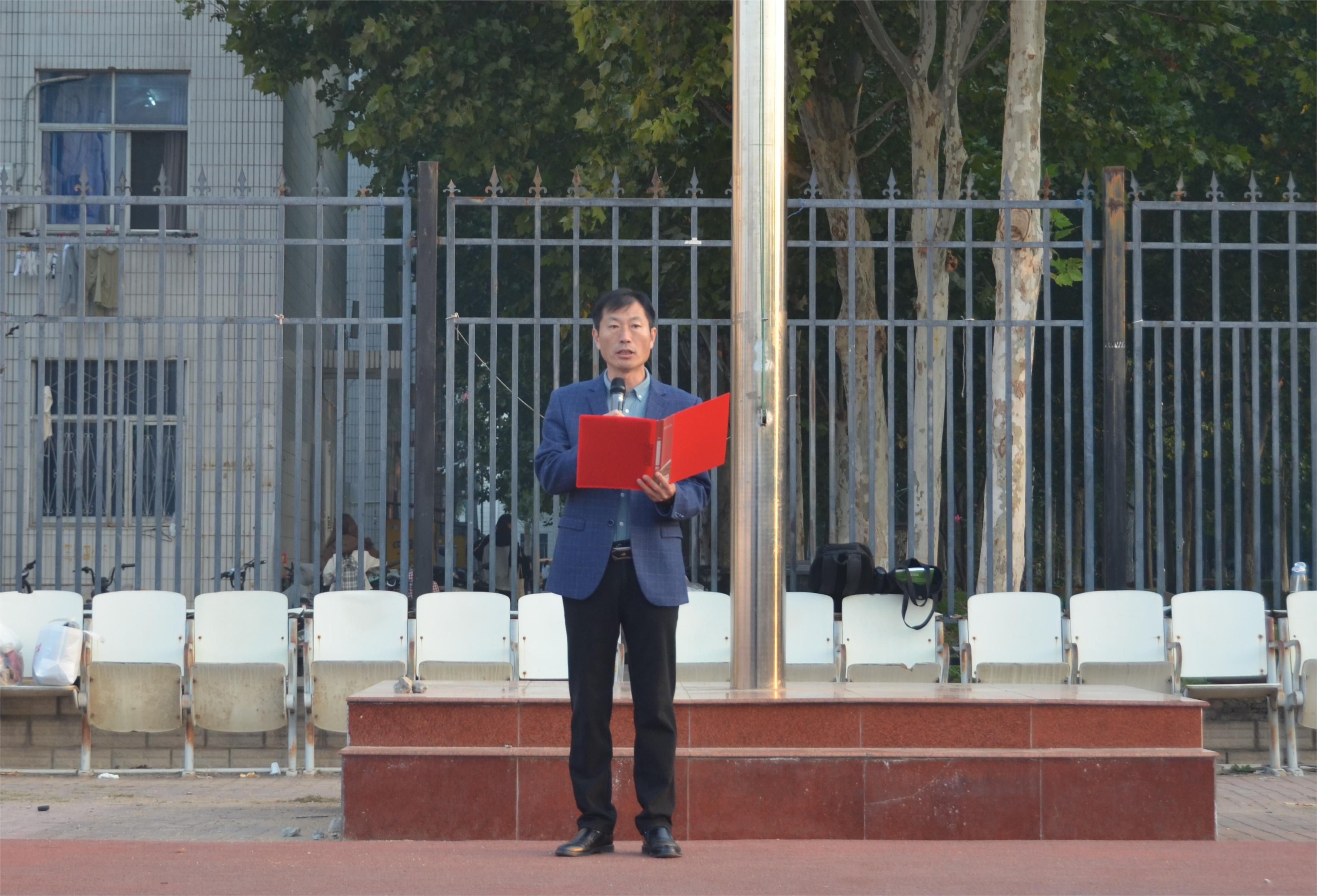上午6时许,全体参与人员准备就位。7时,升旗仪式正式开始。在全体师生的注目礼下,英姿飒爽的国旗护卫队踏着整齐的步伐护送着鲜艳的五星红旗国旗走到旗杆下,行礼完毕后,伴随着庄严的《中华人民共和国国歌》,五星红旗冉冉升起,迎风飘扬。在场的每一个人向国旗行注目礼,合唱国歌,表达对五星红旗的崇高敬意和对祖国繁荣昌盛的深切祝福。