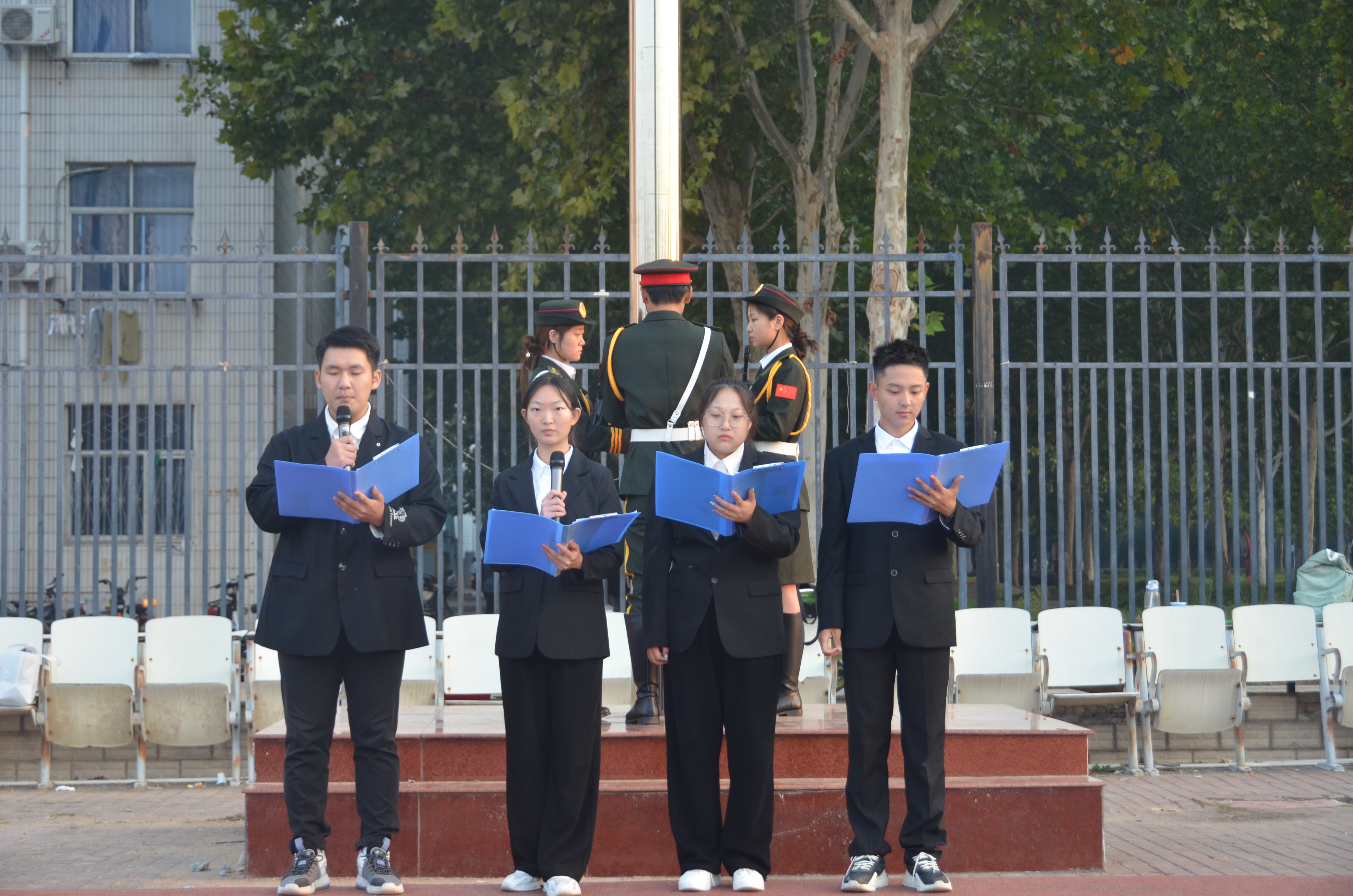 随后,公司陈昱兴、赵佳茜、赵鹏飞、王珺琦等四位同学进行国旗下的朗诵《祖国颂歌》。四位同学以饱满的热情,激昂的语调朗诵了一首爱国主义诗歌,诗歌中充满了对祖国的热爱和对未来的信心。在场师生深受感染,共同感受到爱国主义的深厚情感和公司学子为实现中华民族伟大复兴而奋斗的坚强决心。