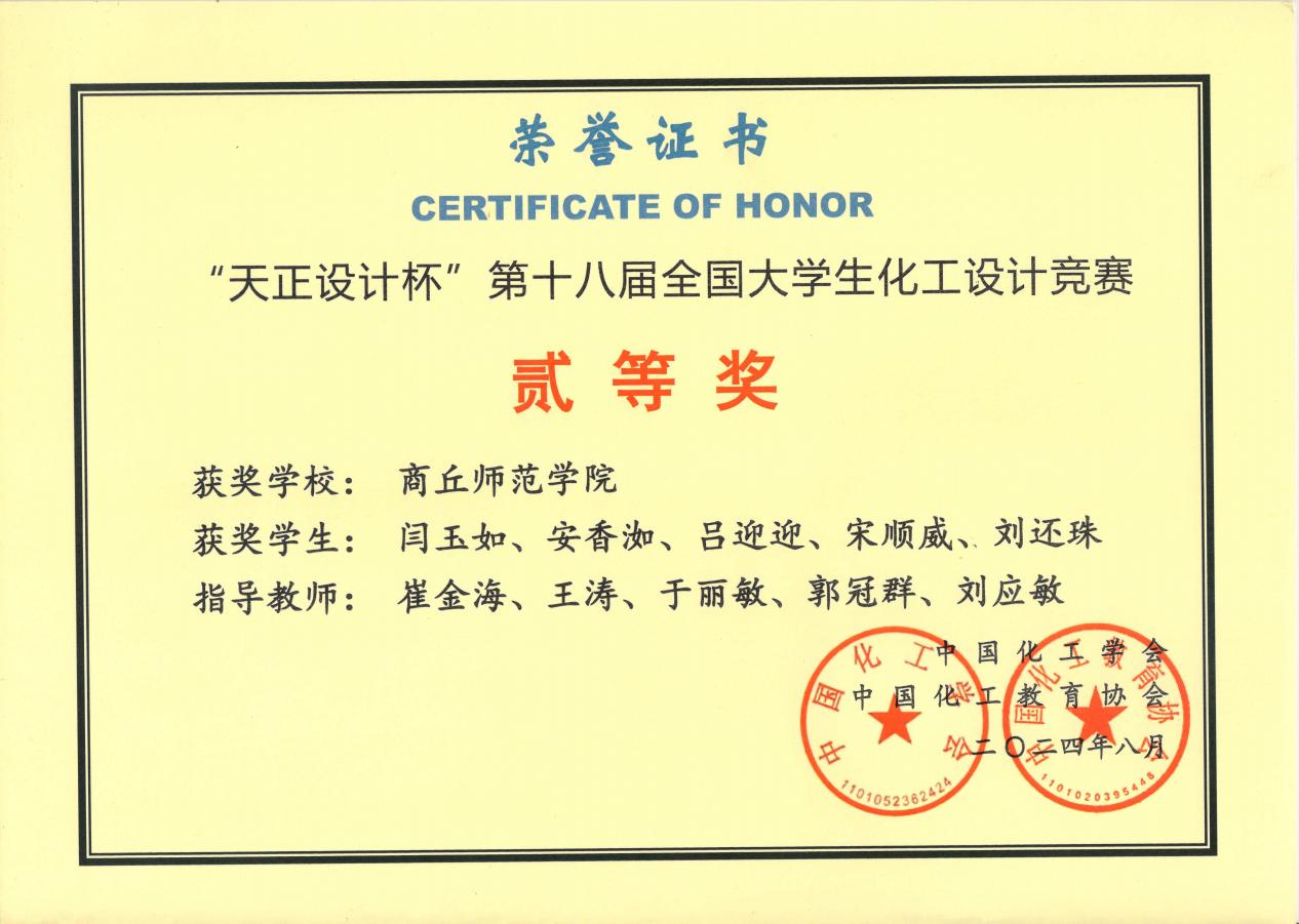 近期,由中国化工学会、中国化工教育协会联合主办的2024年“汇泰•欧倍尔杯”第十八届全国老员工化工设计竞赛全国总决赛圆满落幕。经过激烈角逐,公司由闫玉如、安香洳、吕迎迎、宋顺威、刘还珠五名员工组成“醇臻生产队”在崔金海等老师的指导下再创佳绩,荣获“天正设计杯”第十八届全国老员工化工设计大赛二等奖。