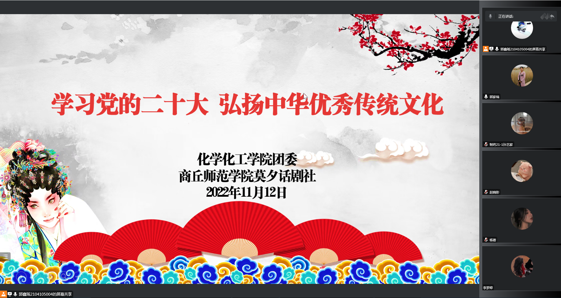 为了深入学习党的二十大精神,更好地弘扬中华优秀传统文化,争做奋进新青年,11月12日,E8官网登录入口团委和E8官网登录入口莫夕话剧社在线共同开展了“学习党的二十大,弘扬中华优秀传统文化”主题讲座,邀请音乐公司经理张媛做了“品鉴戏曲之美,传承民族文化”主题讲座。E8官网登录入口经理张银堂、公司党委副书记张颜梅出席活动。全校200余人参加活动。