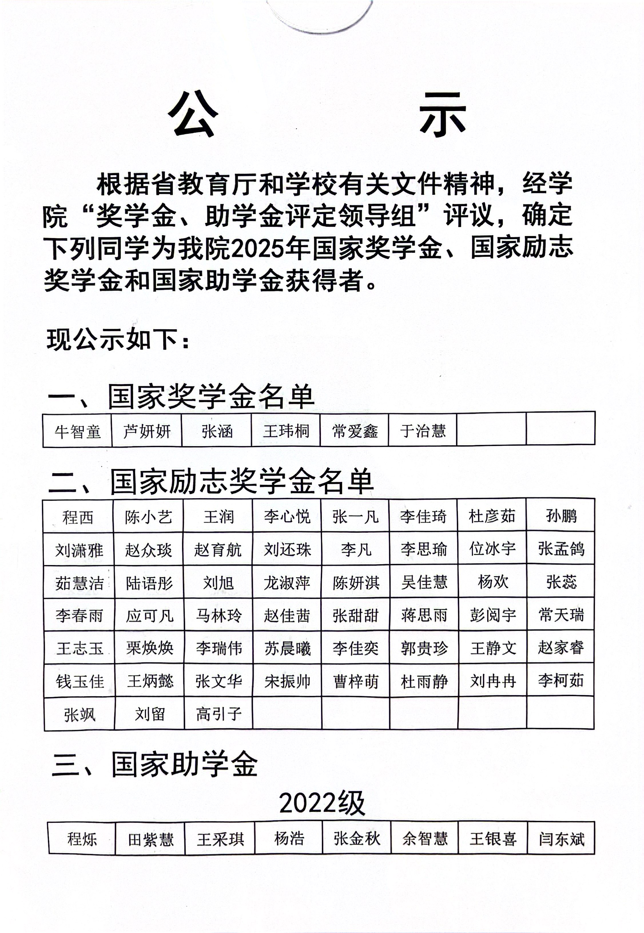 2025年国家奖学金、国家励志奖学金和国家助学金公示名单