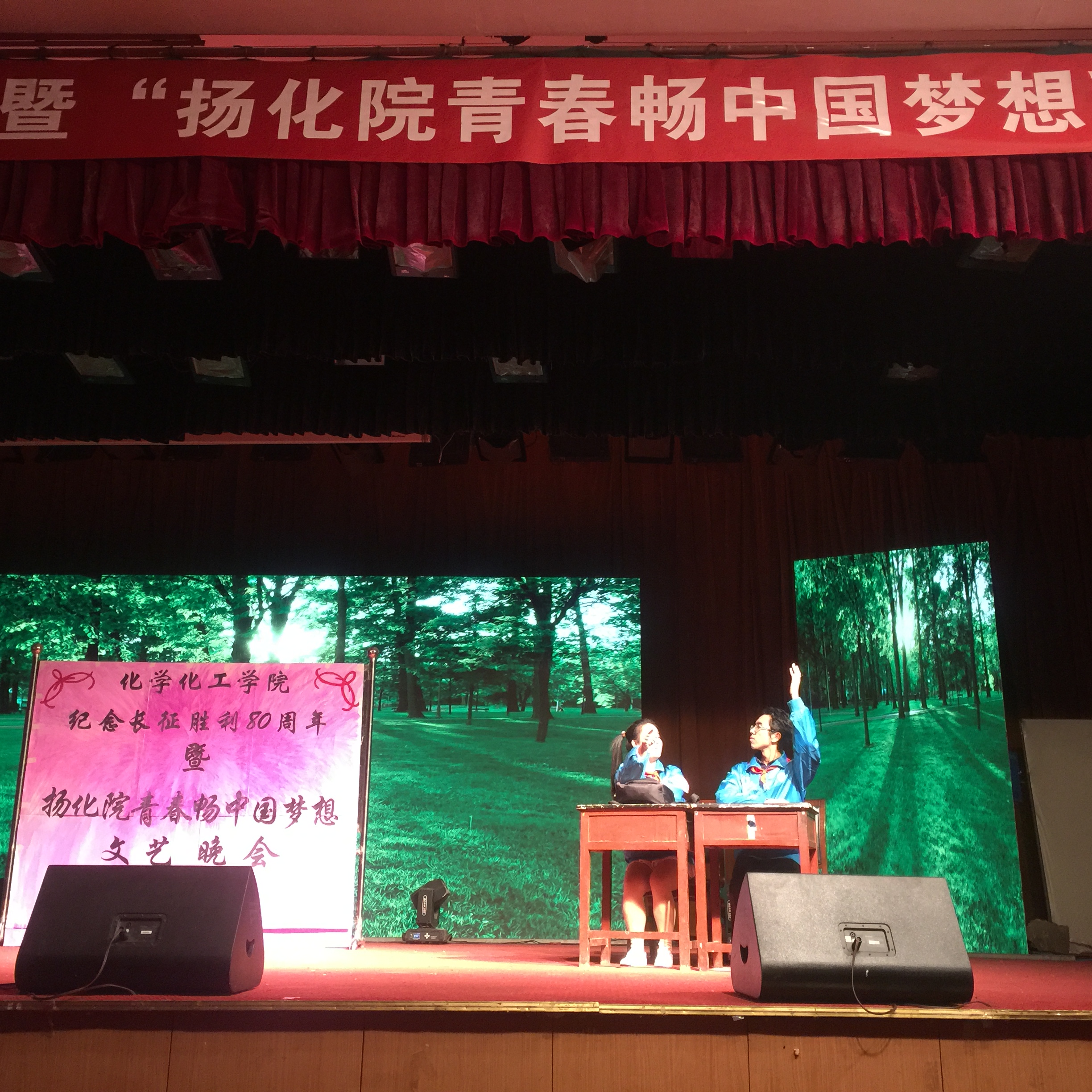 晚会由节奏欢快的《商师小苹果》、《健美操》两段开场舞拉开帷幕。在一段《栀子花开》VCR播放后,反串四小天鹅表演的芭蕾舞赢得掌声阵阵;随后话剧《人生》演绎了一对青梅竹马从相识、相恋到相伴的故事,实力派的表演感动了现场的观众。影子舞《傣族舞》、《拉丁》的表演将两位姑娘的婀娜多姿、优雅动人展现的淋漓尽致,紧接着一场热舞伴随《Bang Bang》爆发力十足的节奏将晚会推向高潮;相声《大众创新》赢得全场欢呼,歌曲串烧《被驯服的象+从你的全世界路过+告白气球+当爱在靠近》以默契的配合和动人的歌声给观众留下了深刻印象;话剧《倔强的小红军》有着沙画动画作背景,演绎了长征时红军们艰苦生活却仍具有坚持不懈的精神,感染了现场的观众;朗诵《长征颂》用激情澎湃的声音再现了红军长征的光辉历程,点燃了同学们心中的那团“祖国需要我”之火。晚会最后,全体师生合唱一首经典的《光阴的故事》。至此晚会圆满落幕。