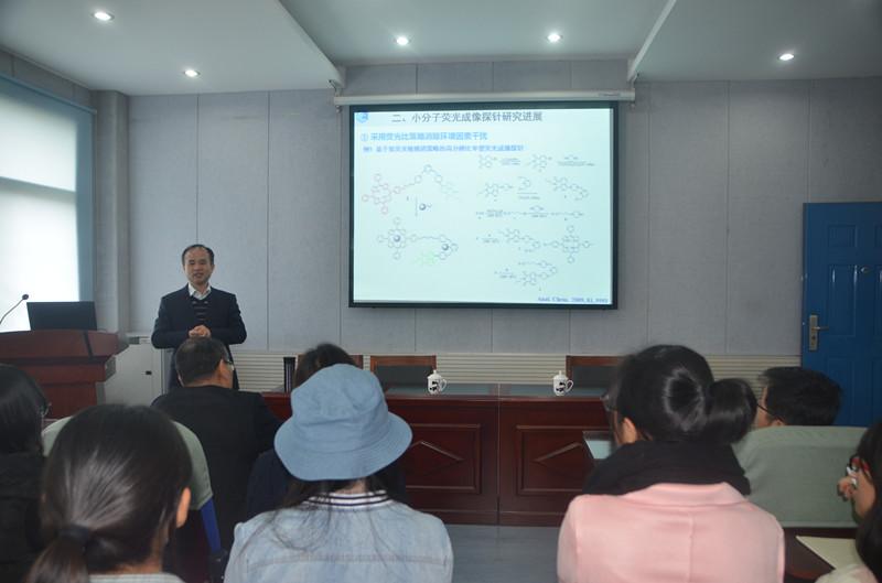 聘任仪式结束后,张晓兵教授在文化路校区化学实验楼311学术报告厅为E8官网登录入口师生作了题为《新型荧光成像探针的构建与应用》的学术报告,报告会由E8官网登录入口经理瞿鹏主持。报告会上,张晓兵教授首先简要概述了荧光探针成像技术的特点、目前存在的缺陷及总体研究思路。随后张教授从小分子荧光探针与纳米荧光成像探针两个方面介绍了自己课题组近几年来取得的重要研究成果。针对目前小分子荧光探针成像检测存在浓度依赖、易受生物背景干扰、难以体内定位等缺陷,张教授课题组基于比率式响应、长波长激发、固态发光等策略成功设计合成了系列高性能的生物成像小分子探针,并提出了数个通用的分子探针的构建方法。利用纳米材料的运载能力与特殊物理化学性质及核酸分子的生物特性,张教授课题组开发了多个用于药物运载与可控释放、光动力学治疗的功能纳米成像体系。最后,张教授介绍了自己课题组最近在核酸纳米材料制备与应用方面开展的原创性研究工作与最新进展。张教授的报告系统严谨,讲述生动清晰,并从研究思路的设计及研究工作的开展到相关成果的整理发表,给大家分享了自己科研历程背后的故事,让参加报告会的师生深受触动与启迪。随后,张教授还与部分师生进行了问答互动。