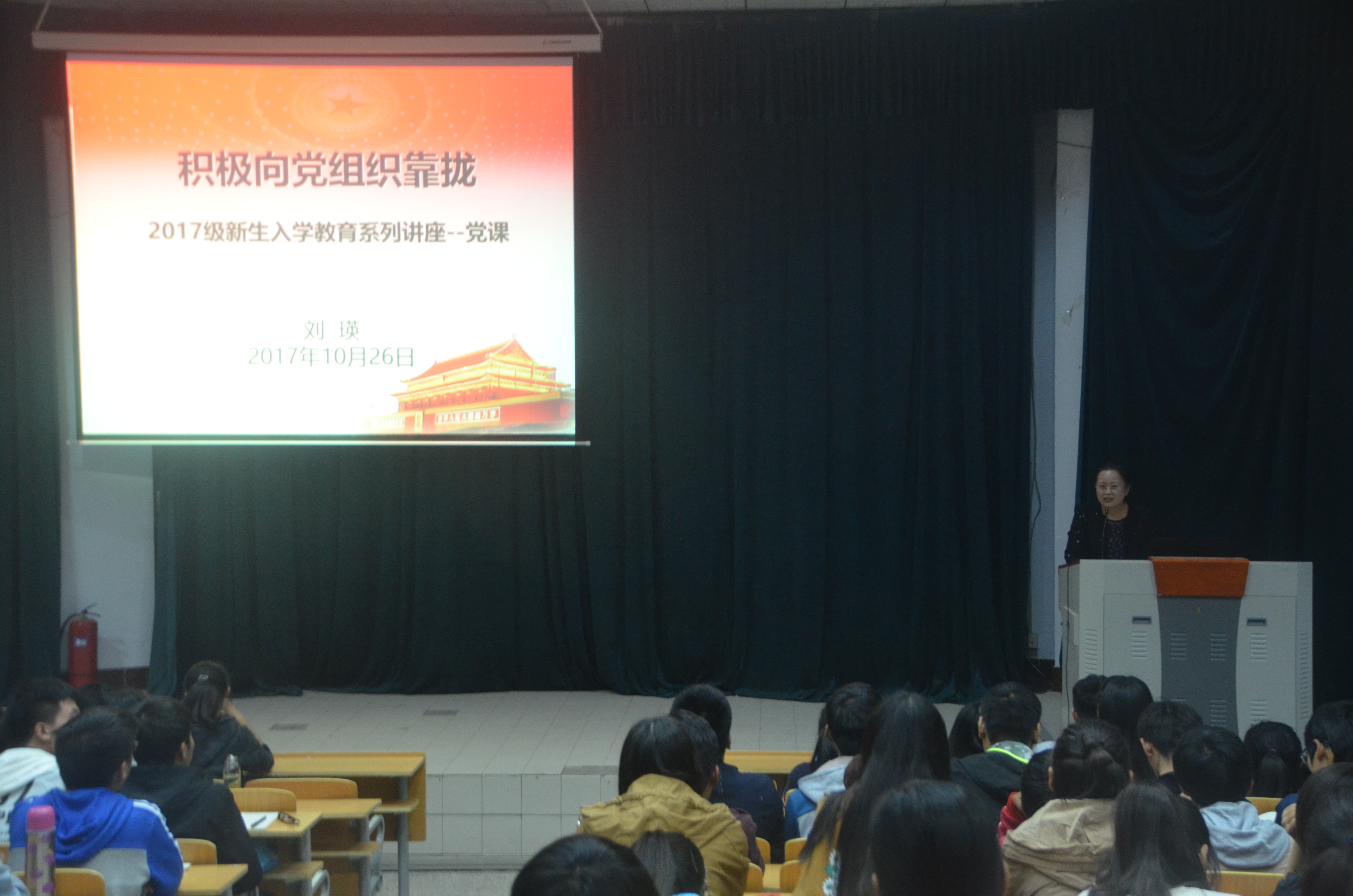 刘书记以“积极向党组织靠拢”为题,为2017级新生入学教育系列讲座进行了开讲。讲座伊始,刘书记先从革命先烈和优秀共产党员的先进事迹讲起,带领同学们回顾了中国共产党96年的奋斗历程,使同学们充分认识到没有共产党就没有新中国,没有共产党的领导就没有现代中国的一切,中国共产党是值得当代青年追随的一个政党。同时使同学们进一步明白了老员工为啥要入党。接下来她详细介绍了入党申请书、思想汇报、个人自传的书写要求。最后,刘书记向全体新同学发出了积极加入党组织的号召,希望同学们能够深入学习党的基础知识,科学文化知识,积极向党组织靠拢,争取早日加入中国共产党,为中华民族伟大复兴贡献自己的一份力量。