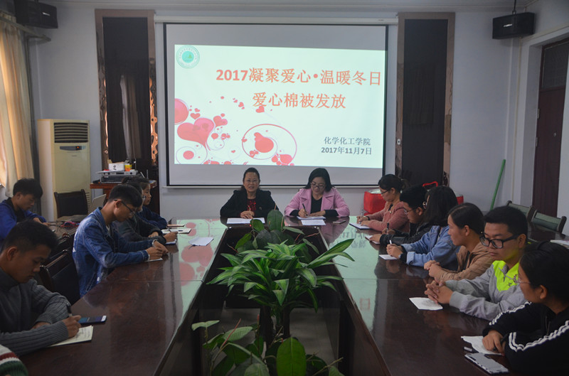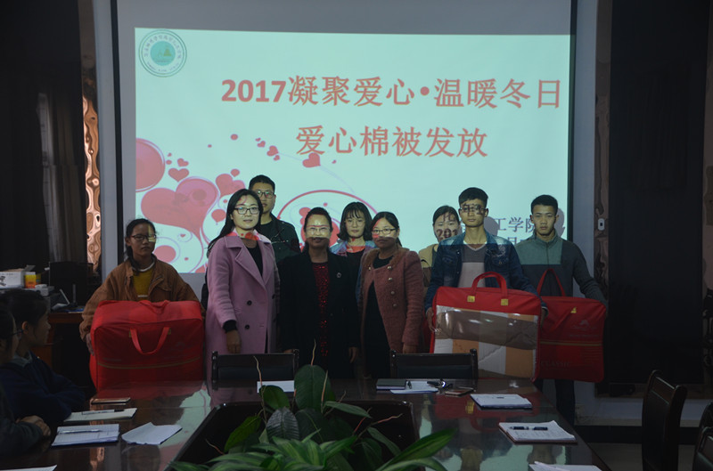 活动伊始,李龙梅老师首先介绍了由校团委开展的“凝聚爱心·温暖冬日”暨2017年“一元钱”爱心基金帮扶活动,资助形式主要是为受助员工发放爱心棉被、爱心返乡车票、爱心聚餐,本次活动主要是为受助员工发放爱心棉被。接着,党总支副书记刘瑛发表了讲话,她指出此次活动代表了党、政府、公司团委以及公司对贫困员工的关心和关爱,公司将通过全方位、多渠道的方式加大对贫困生资助的力度,并对这些贫困生寄予了殷切希望:一是正视现实,迎难而上;二是积极学习,努力向上;三是传递爱心,感恩社会。最后刘书记、李老师及郭老师共同给受助员工发放了棉被,接到棉被后,同学们都露出了灿烂的笑容。