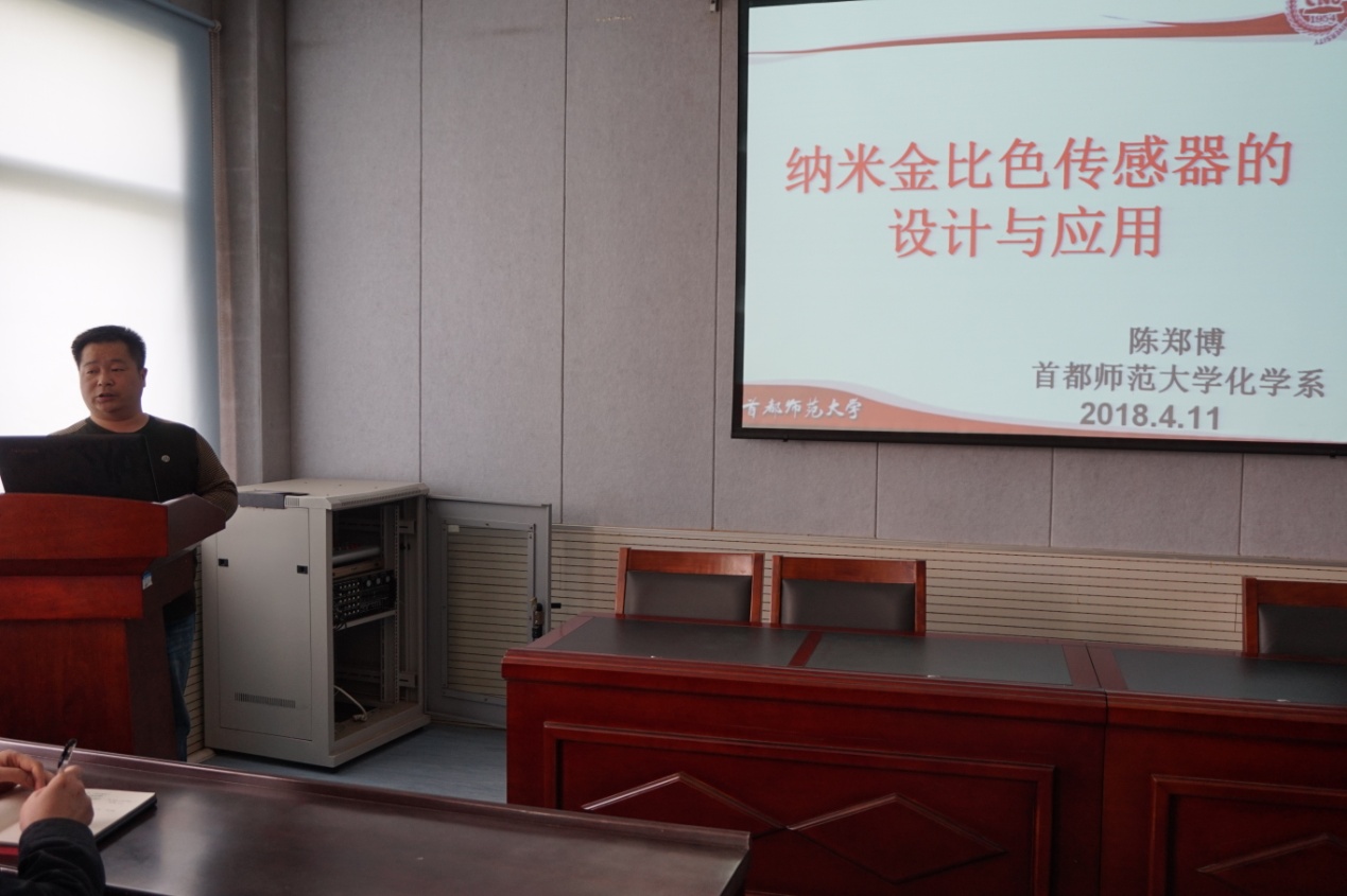 2018年4月11日上午,首都师范大学陈郑博博士应邀在化学实验楼学术报告厅做了题为“纳米金比色传感器的设计与应用”的学术报告。报告会由E8官网登录入口瞿鹏经理主持,40多名老师、研究生及高年级本科生聆听了此次报告。