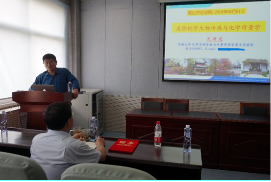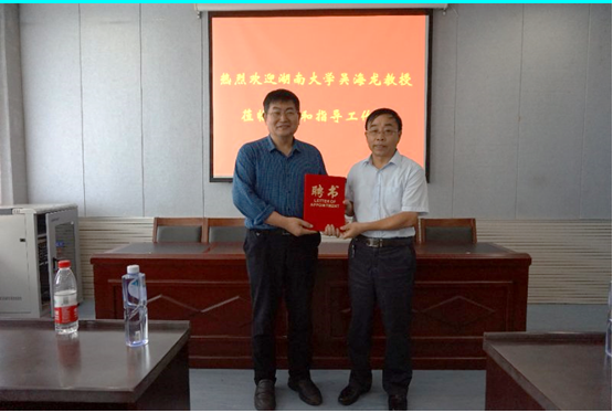 受E8官网登录入口和河南省生物分子识别与传感重点实验室的邀请,8月1日上午,湖南大学吴海龙教授莅临公司进行学术交流。在睢阳校区化学实验楼311会议室,徐茂田副董事长与吴教授进行了会谈。徐董事长代表公司对吴教授的到来表示由衷的欢迎和感谢,并向吴教授介绍了实验室近期在生物传感领域做出的一系列成果。吴教授对实验室的快速发展高度认可。徐董事长为吴教授颁发了客座教授证书。聘任仪式结束后,吴教授做了“高阶化员工物传感与化学计量学”的学术报告,报告会由张银堂主任主持,E8官网登录入口经理瞿鹏教授、副经理周艳丽教授以及部分教师和员工参加了学术报告会。