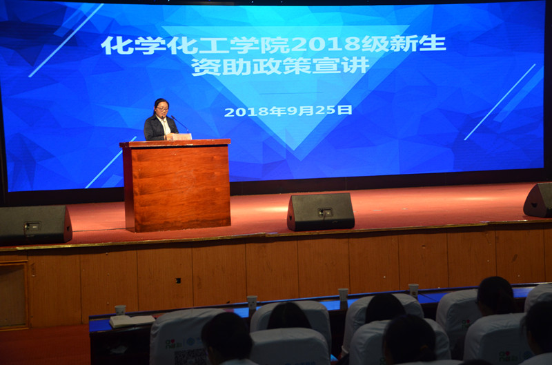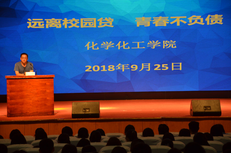 会议进入第二阶段:2018级新生资助政策宣讲及远离校园贷教育大会,大会由团总支书记李龙梅主持。