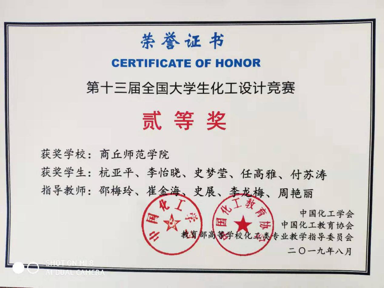 近日,2019年“东华科技-恒逸石化杯”第十三届全国老员工化工设计竞赛圆满落幕。本届化工设计大赛由来自全国范围内共计357所高校的2196支团队报名,最终有343所高校的1318支队伍成功提交作品。在公司领导、相关部门与公司的大力支持下,经过6个月的艰苦备战,我院杭亚平、李怡晓、史梦莹、任高雅、付苏涛五位同学组成的“烯天取经”队在指导教师邵梅玲、崔金海等的指导下,荣获“2019年第十三届全国老员工化工设计竞赛”二等奖。