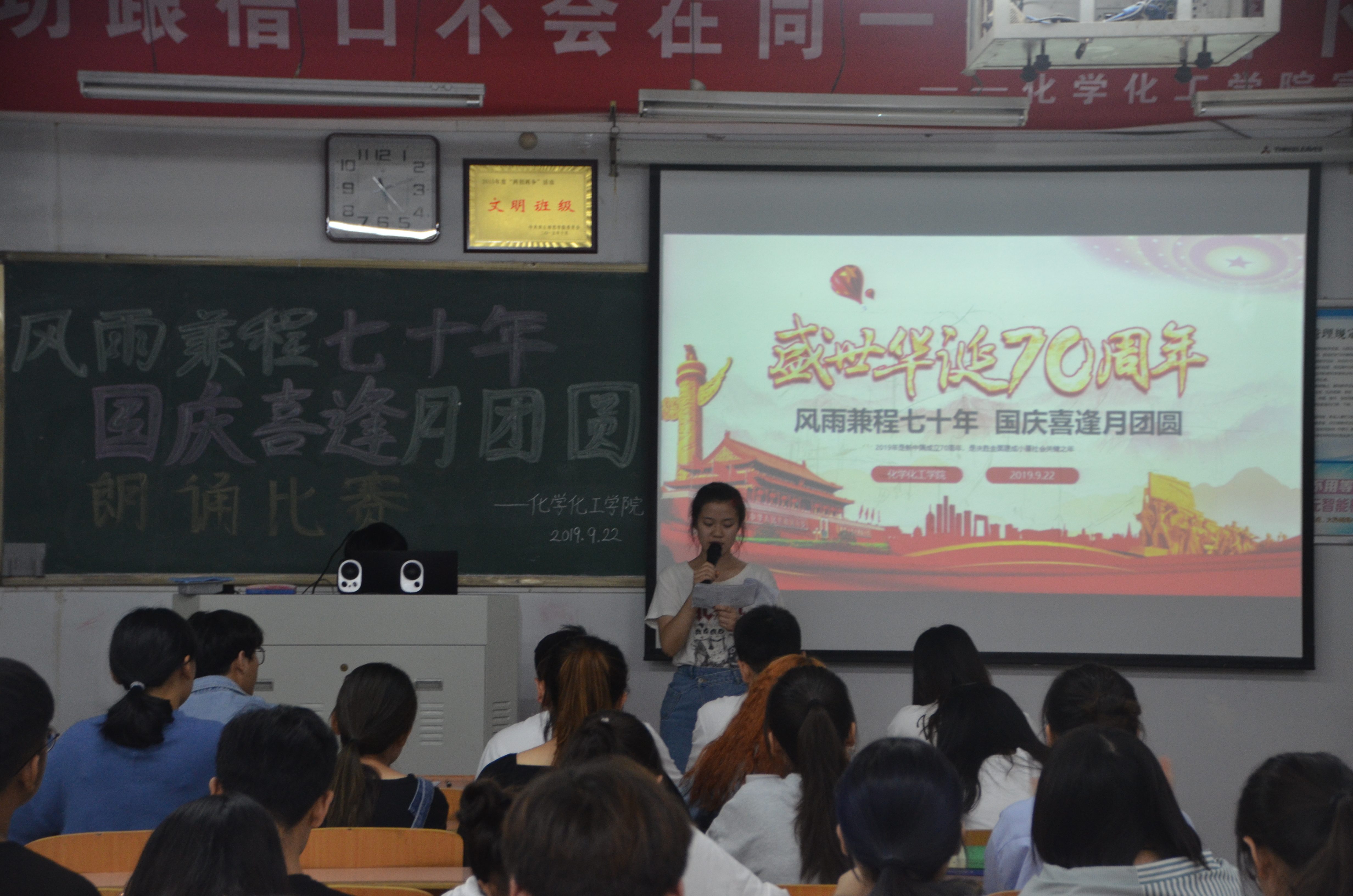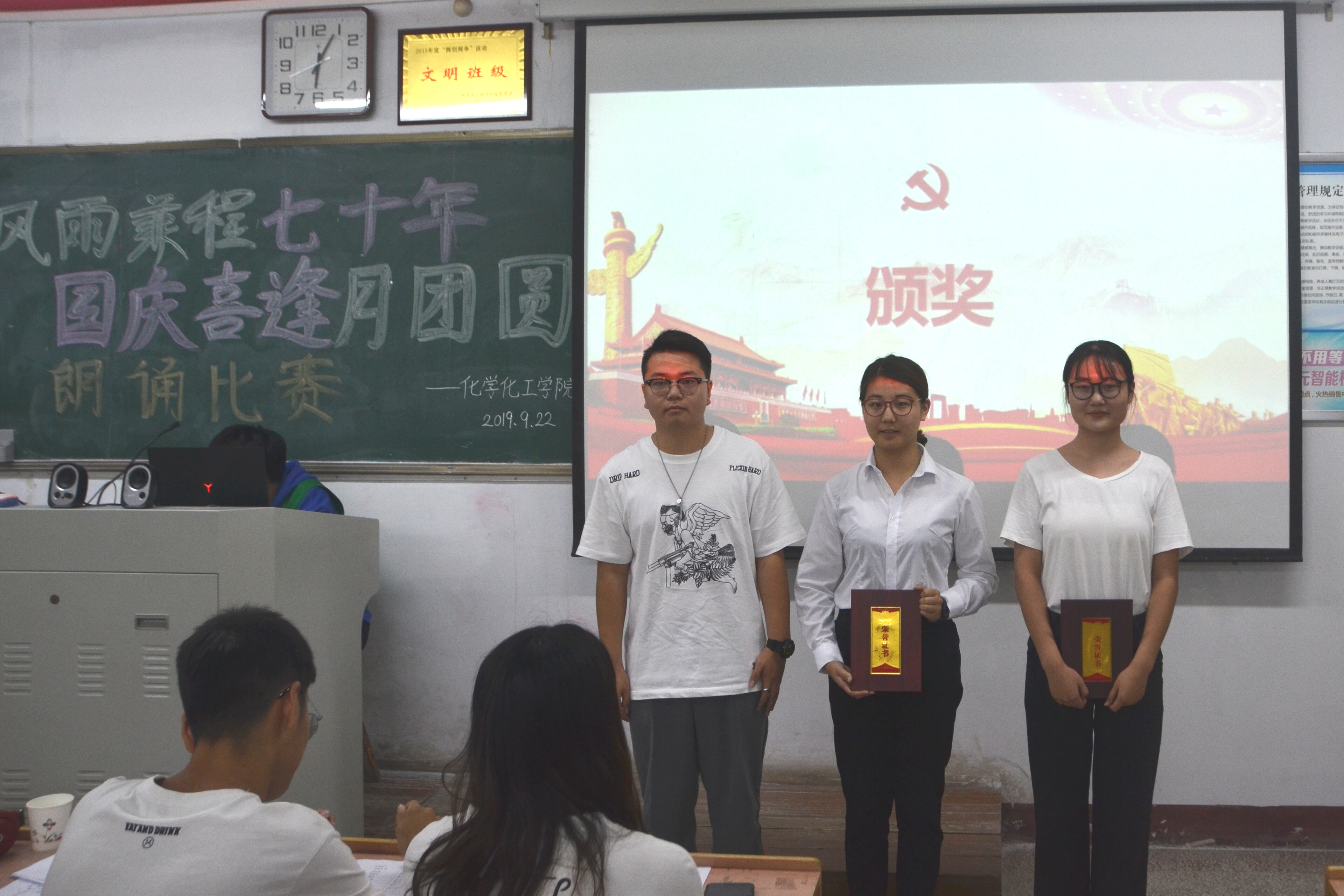 壮丽七十年,奋斗新时代。朗诵比赛在一段祝福祖国的视频中拉开序幕,在主持人慷慨激昂的开场白下,参赛选手依次上场,向在场的每一个人传达着对祖国的爱。一声声呐喊,一股股豪情,一片片赤胆忠心,一首首慷慨悲歌,凝结着多少代人的痛苦、辛酸、信念、奋斗。是十月革命和南湖红船带来了胜利的曙光;是镰刀斧头和井冈山红旗唤醒了民;是枪杆子里出政权的铿锵誓言,点燃了中国革命的星星之火,回顾过去,我们雄心激;展望未来,我们豪情满怀。经过激烈的比赛,蔡莹、田梦格、张芳源、袁雨立、周慧茹、张月娥一队和祁荧荧、郭晗瑜一队荣获一等奖。最后,朗诵比赛在颁奖仪式中圆满结束。