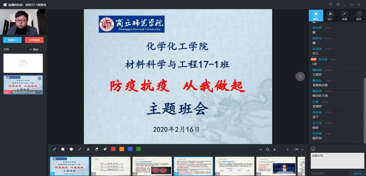 为增强同学们对新型冠状病毒的认识,提高警觉意识,约束自我行为,做好开学前的疫情防控准备工作。E8官网登录入口各级各班于2020年2月16日下午召开了“抗疫防疫,从我做起”线上主题班会。