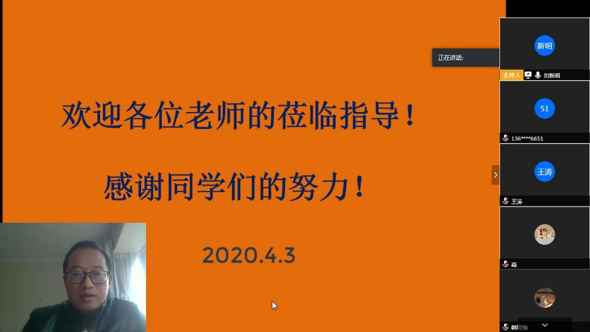 本次课结束后,参与观摩老师对刘老师的公开课进行了点评。充分肯定了刘老师在疫情期间对在线教学全身心的投入。孟团结对同学们在家里上网课提出了几点要求和期望,要求同学们尽一切努力保证在线学习的效果,认真完成各项学习任务,锻炼自我管理、自我约束能力,希望大家在开学后的检测、期末考试乃至研究生入学中有机化学都能取得优异的成绩!