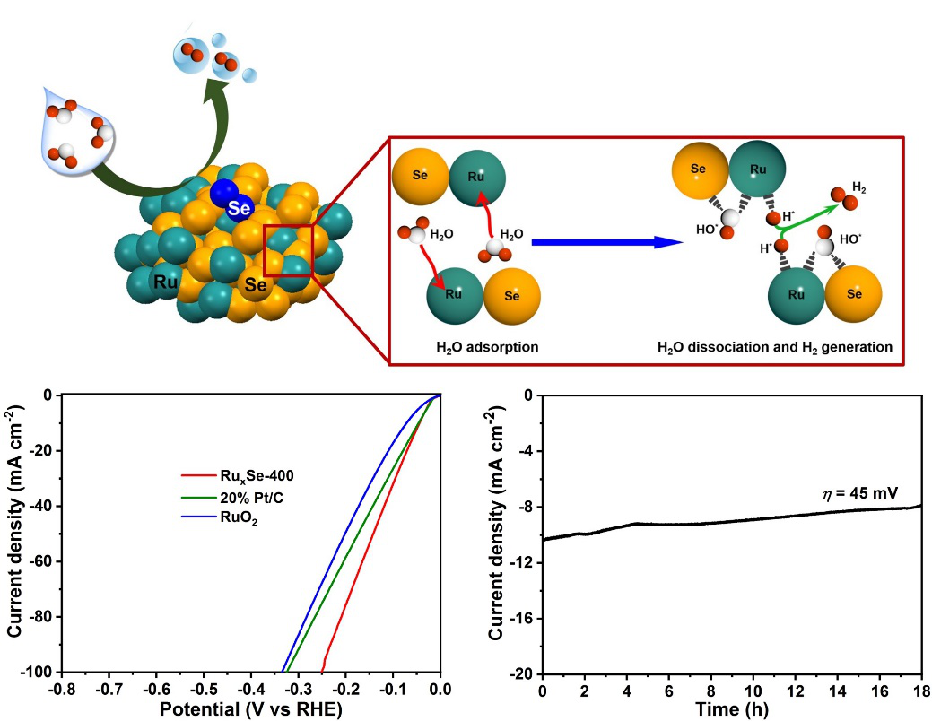 因为贵金属钌能够促进水分子解离过程,同时钌与氢键合强度与铂与氢键合强度相当,因此钌作为析氢反应(HER)电催化剂受到广泛的关注,但是钌表面极强的亲氧性导致OH等含氧物种在其表面吸附过强而不易离去,不利于氢的吸附,因此制约了电催化析氢反应的整体过程。基于此,本研究采用富硒态的RuSe2 (RuxSe)纳米晶作为碱性介质中析氢反应催化剂,DFT理论计算表明RuSe2纳米晶表面吸附过量的Se可有效降低水分子的解离能,同时OH的吸附位点由RuSe2中的低配位Ru位点转移至Ru-Se桥位点上,从而降低了HER反应中间产物的吸附反应对Ru位点的依赖性,提高了电催化析氢活性。所得催化剂在KOH溶液中表现出优异的电催化析氢性能,在未进行IR矫正的条件下,当电流密度达到10 mA cm-2时所需的过电势为45 mV,塔菲尔斜率为31.4mV dec-1,且表现出优异的电催化稳定性。该成果是继2018年8月王科峰博士在国际知名期刊Small(Small, 2018, 14:1802132)上发表关于TiO2纳米管阵列负载RuxSe纳米粒子用于碱性电催化析氢反应后的又一进展,在此工作基础上,本文对钌的硒化物的电催化析氢反应机理展开深入研究,本项工作中将不同中间产物活性位点分离以促进电催化反应的策略为其它新型高效电催化材料的研发提供了新思路。
