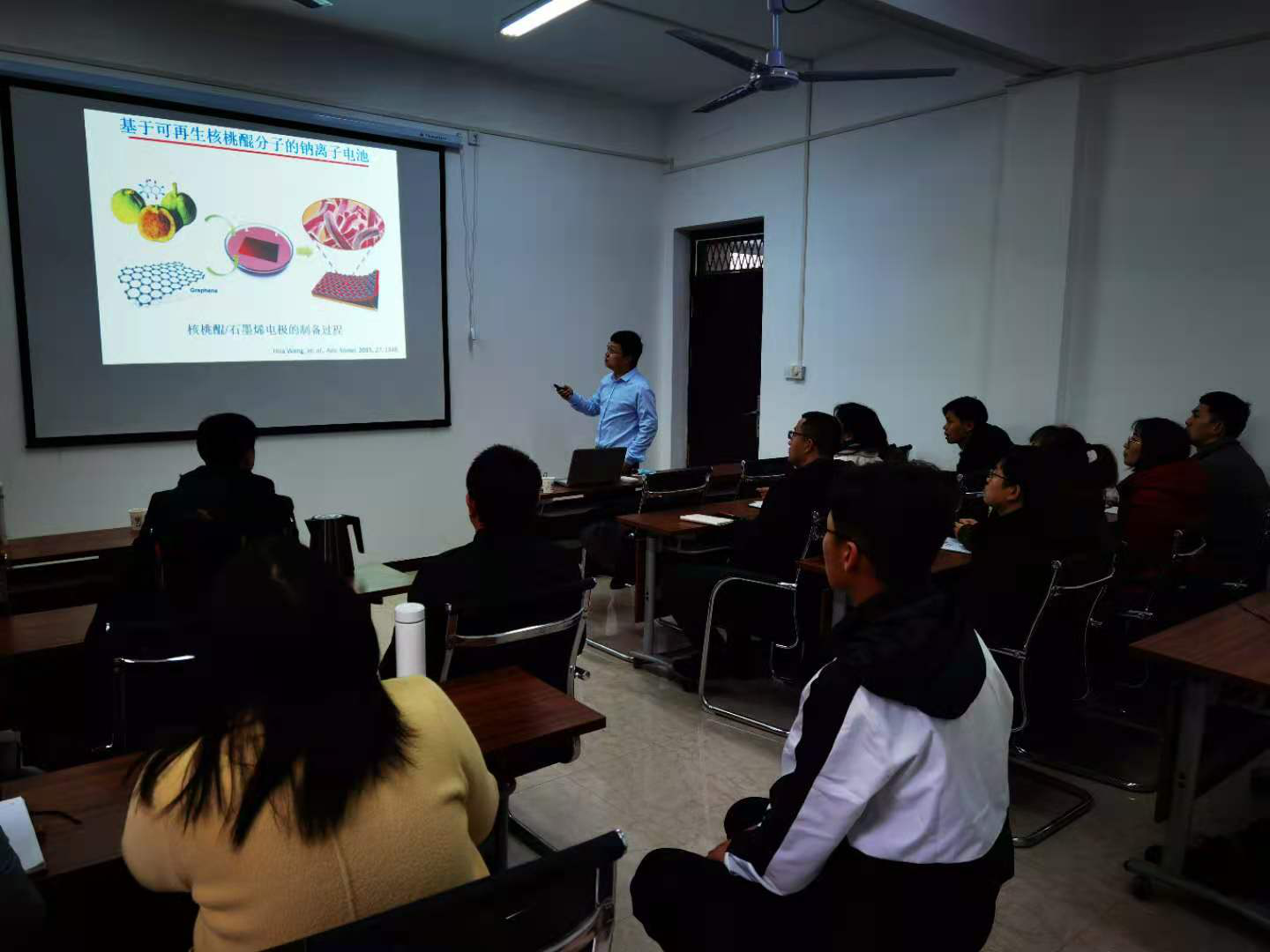 在学术报告中,王华教授指出未来的储能设备的发展方向是生物质储能,并以自己的几个研究实例,如生核桃外皮,跟大家介绍了当前生物质储能的研究进展。接着又向大家介绍了柔性可穿戴储能设备的研究进展,他们研究小组研制出了“电线电池”的雏形,为未来便携式移动电源设备做出了贡献。最后,王华教授又介绍了课题组的一系列金属单质高性能电极材料。报告结束后,王华教授鼓励青年教授要注重学术交流,并指出合作是出高水平成果的一个重要途径。