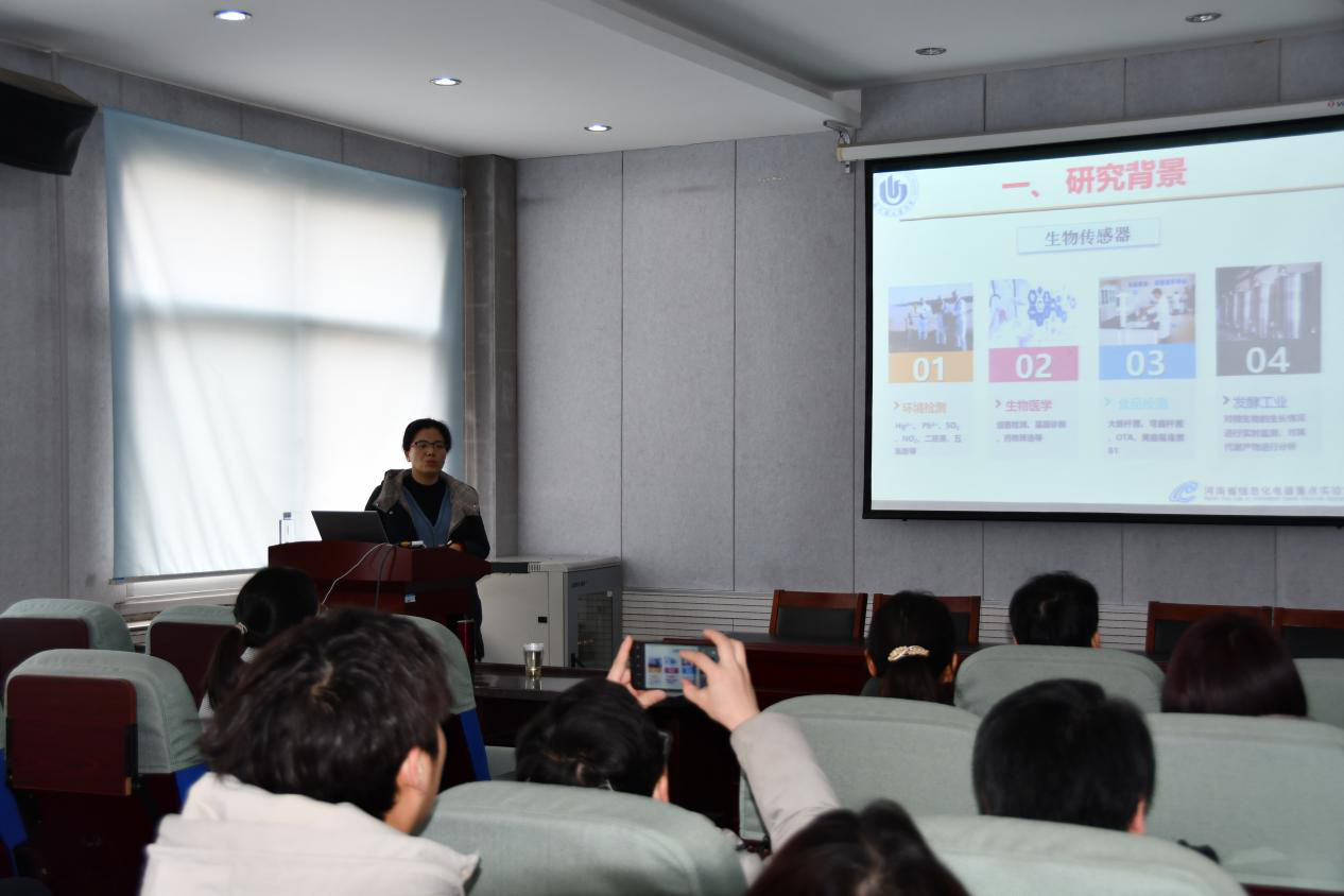 2020年12月28日上午,郑州轻工业大学姜利英教授应邀到公司睢阳校区E8官网登录入口化学实验楼311会议室做了题为《基于核酸适体的生物传感器研究》的学术报告。讲座由E8官网登录入口副经理周艳丽教授主持,河南省生物分子识别与传感重点实验室全体师生聆听了报告。