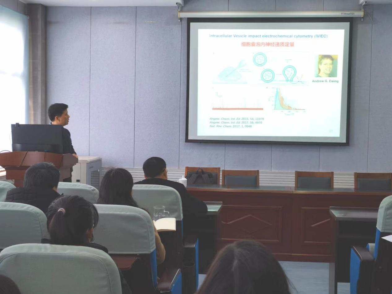黄卫华教授从新型纳米电极亚细胞实时探测、功能化传感界面构建、用于细胞实时动态监测及柔性可拉伸电化学传感等多个方面介绍了其团队在细胞生命活动实时电化学监测方面的工作。整个报告图文并茂、深入浅出,受到了在座师生的一致好评。