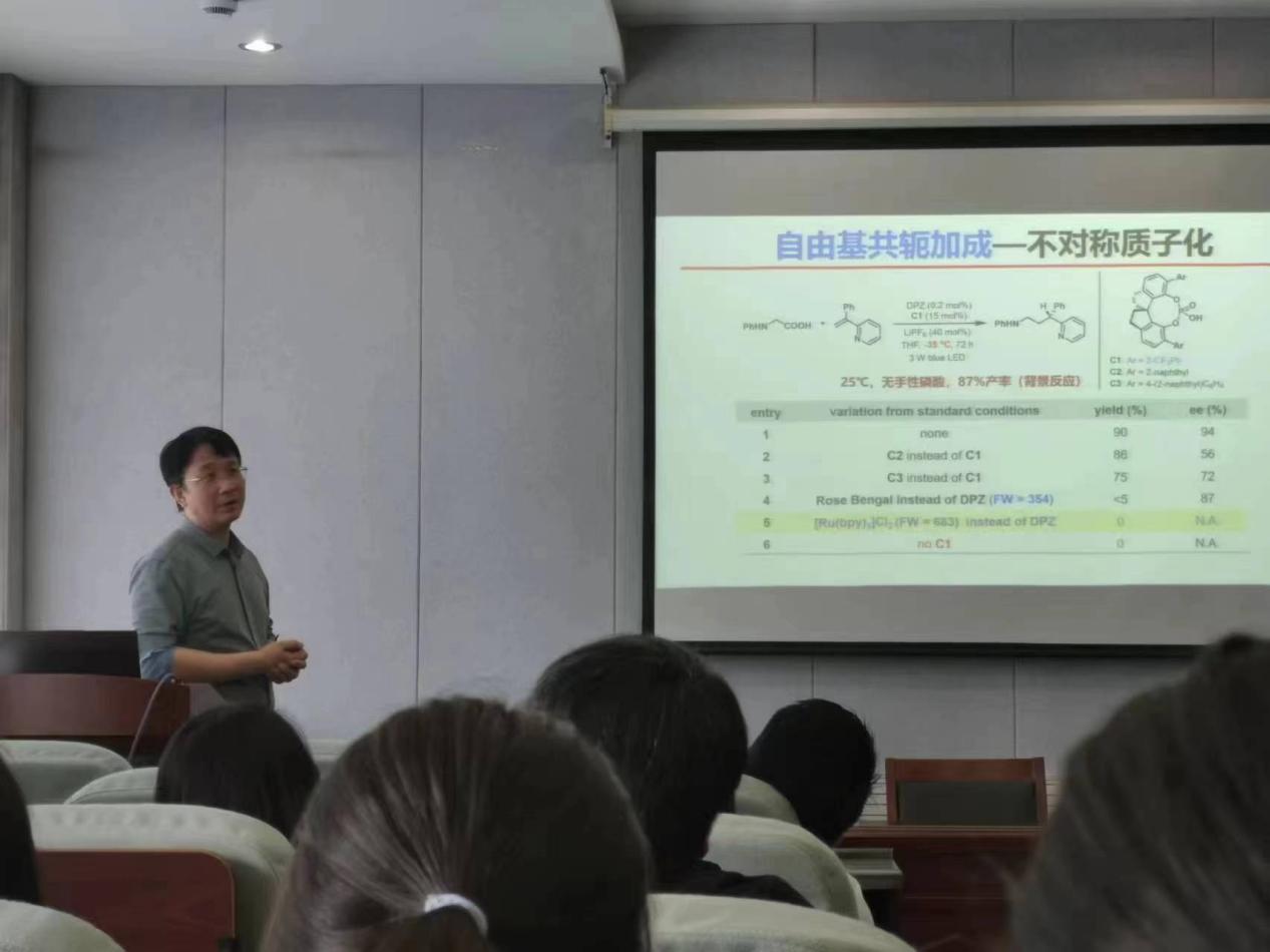 江智勇教授详细介绍了近年来课题组围绕自主研发的DPZ光敏剂协同催化实现的一系列不对称有机催化反应。对如何建立高活性基态与光氧化还原激发态有机催化平台,如何完成系列新颖的离子型与自由基型不对称反应进行了深入浅出的介绍。会后,江教授分享了自己开展研究的心路历程,鼓励青年教师勇于创新、敢于突破,做有特色的科学研究。