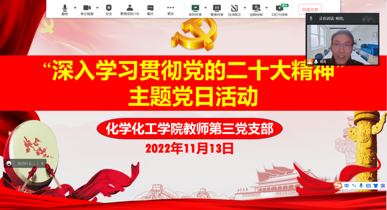 为在思想和行动上与党中央保持一致,11月13日,E8官网登录入口教师第三党支部利用腾讯会议举行“深入学习宣传贯彻党的二十大精神”线上主题党日活动。本次活动由党支部书记张明亮同志主持,支部全体党员参与。