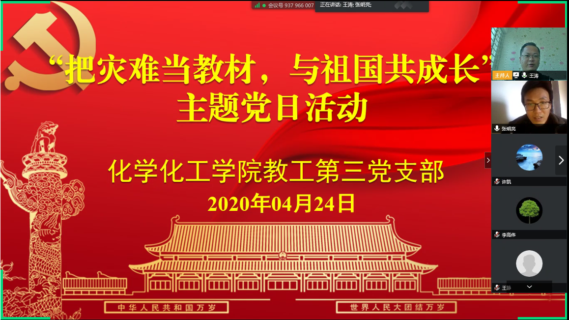按照《中共E8官网登录入口委员会关于开展“把灾难当教材 与祖国共成长”主题教育活动的通知》要求,4月24日下午,化学化工公司教工第三党支部组织党员教师利用腾讯会议在线开展了“把灾难当教材 与祖国共成长”主题党日活动。活动由教工第三党支部书记王涛主持。