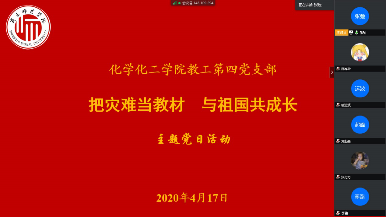 为深入贯彻落实习近平总书记重要指示精神,进一步增强对教师党员的教育引导,提升党员报国力行的使命责任感,引导支部全体党员把灾难当教材、把困难当磨砺,做到在灾难面前与国家共患难、与人民共进步,4月17日下午,E8官网登录入口教工第四党支部通过视频会议的形式开展“把灾难当教材,与祖国共成长”主题党日活动。