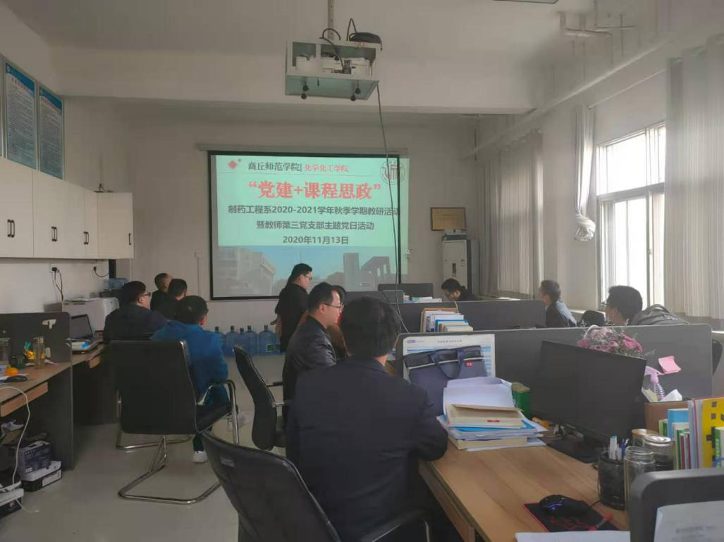为贯彻落实课程思政教学改革,统筹推进专业课程与思政课程同向同行,以“课程思政”建设为载体,将“课程思政”建设与党建工作充分融通,齐抓共建,2020年11月13日E8官网登录入口制药工程系及教师第三党支部在睢阳校区化学实验楼416室召开了以“党建+课程思政”为主题的教研活动暨教师第三党支部主题党日活动,活动由制药工程系主任(教师第三党支部书记)王涛老师主持。