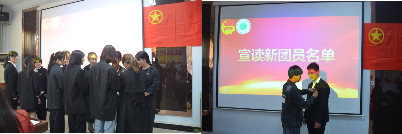全体师生起立,奏响国歌。接着宣布新团员名单,由老团员代表为新团员佩戴团徽。由团组织负责人刘晓宣领誓,鲜艳的团旗下,新团员举起右手庄严宣誓,老团员重温入团誓词:“我志愿加入中国共产主义青年团,坚决拥护中国共产党的领导,遵守团的章程,执行团的决议,履行团员义务,严守团的纪律,勤奋学习,积极工作,吃苦在前,享受在后,为共产主义事业而奋斗!”