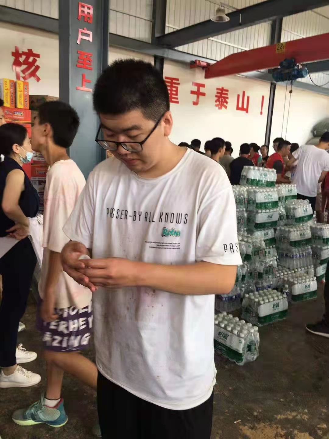 刘智醇在河南新乡市暴雨抗洪救灾活动中,在辉县市教体局的组织下,在辉县市人民武装部和步云公司厂房等地方做志愿者活动,协助搬卸救援物资,并分发给受灾群众。