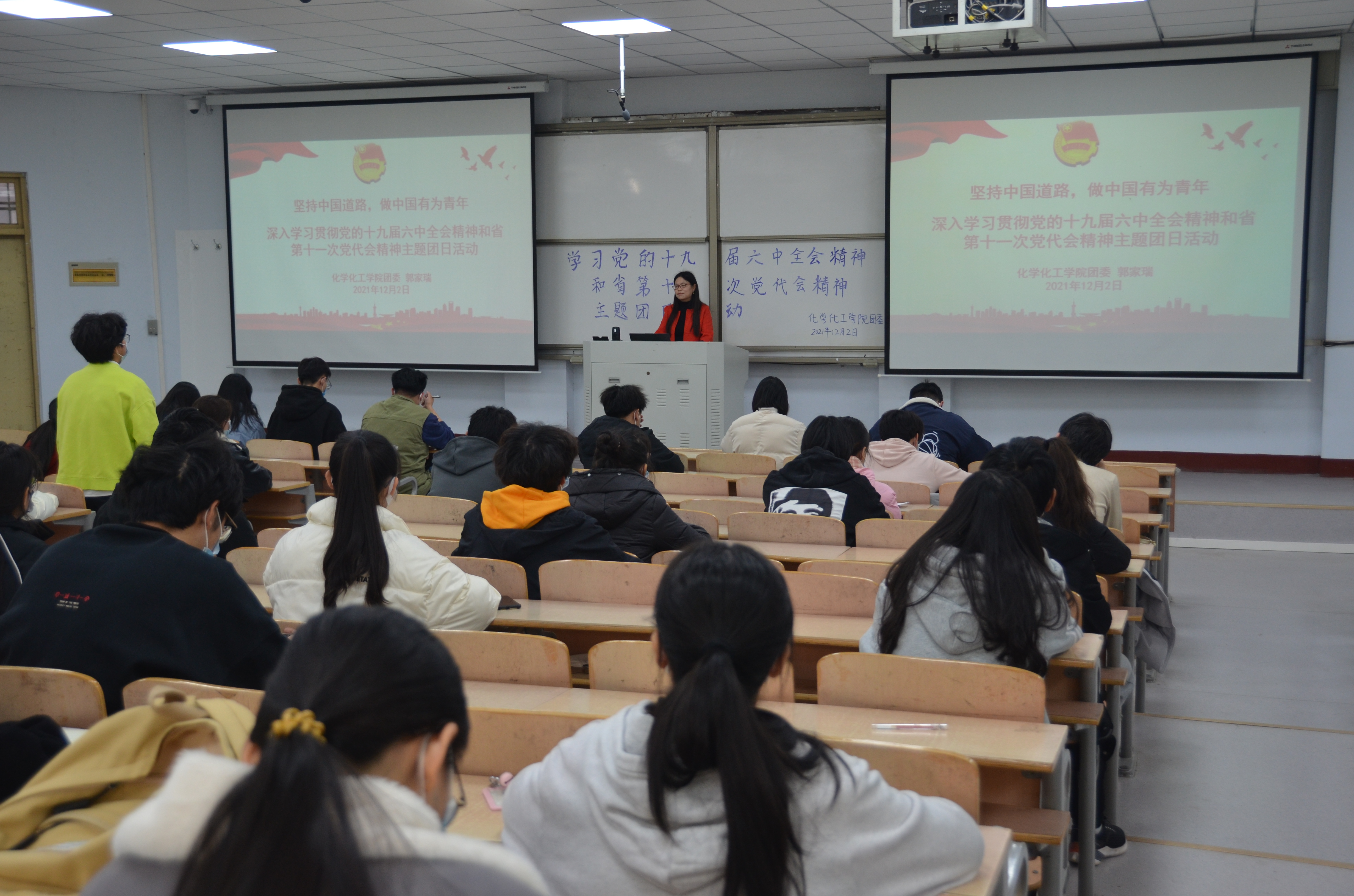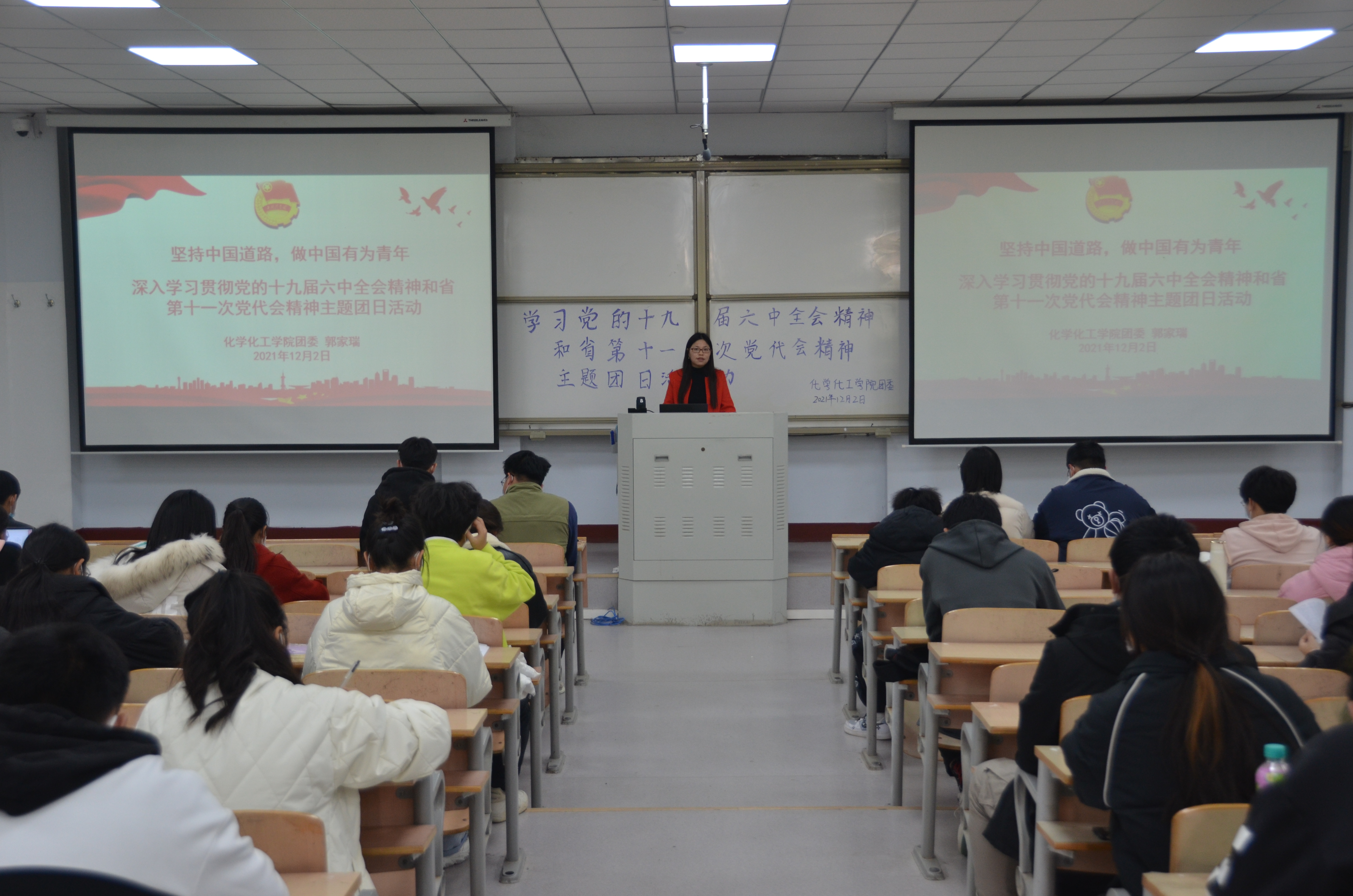 12月2日,E8官网登录入口团委于睢阳校区1号教学楼106教室开展“党的十九届六中全会精神宣讲”活动。院团委副书记郭家瑞主持,公司第五期青马培训班全体学员参加。