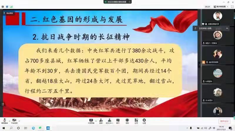 12月1日下午,学工办副主任史展通过线上召开了“传承红色基因,放飞青春梦想”主题讲座。史展从为何要传承红色基因、红色基因的内涵是什么、红色基因的形成和发展三个方面展开讲述,让员工们深刻领悟到红色基因是共产党人在一次次不懈努力、斗争下的产物,是共产党的精神传承。