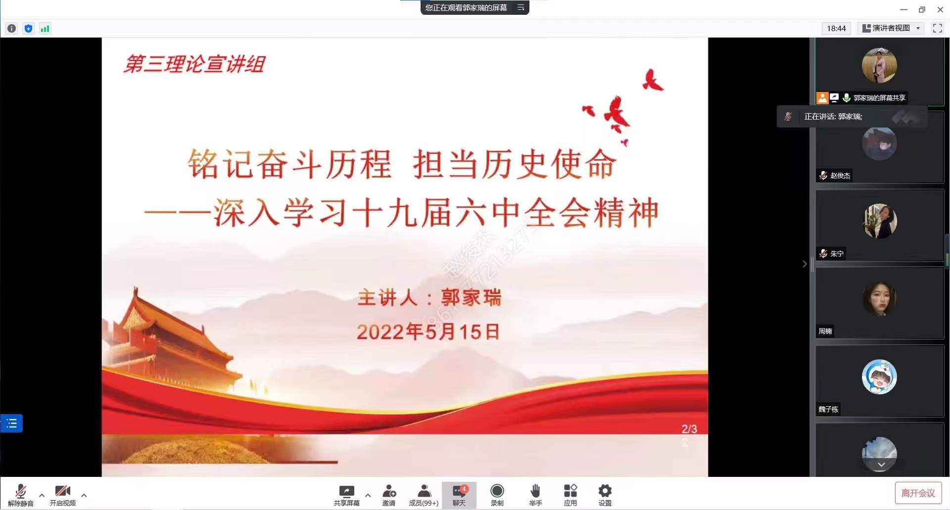 本次党课以“铭记奋斗历程 担当历史使命”为题,紧紧围绕党的十九届六中全会精神进行学习。郭家瑞带领全体党员深刻领会“党的十九届六中全会精神”以及《中共中央关于党的百年奋斗重大成就和历史经验的决议》的相关内容,准确领悟“十个坚持”的丰富内涵。强调我们要始终坚持全心全意为人民服务的宗旨,立足实际,多为同学办实事,充分发挥党员先锋模范作用。
