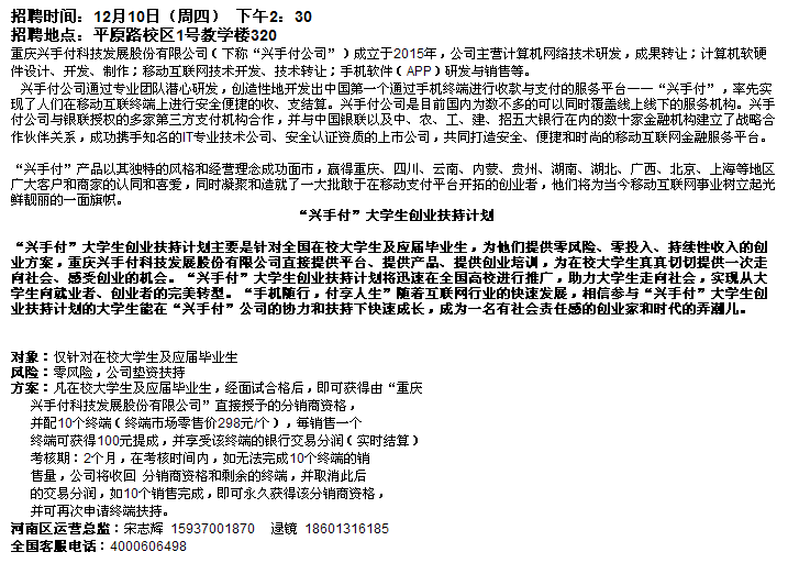 重庆兴手付科技发展有限公司专场招聘