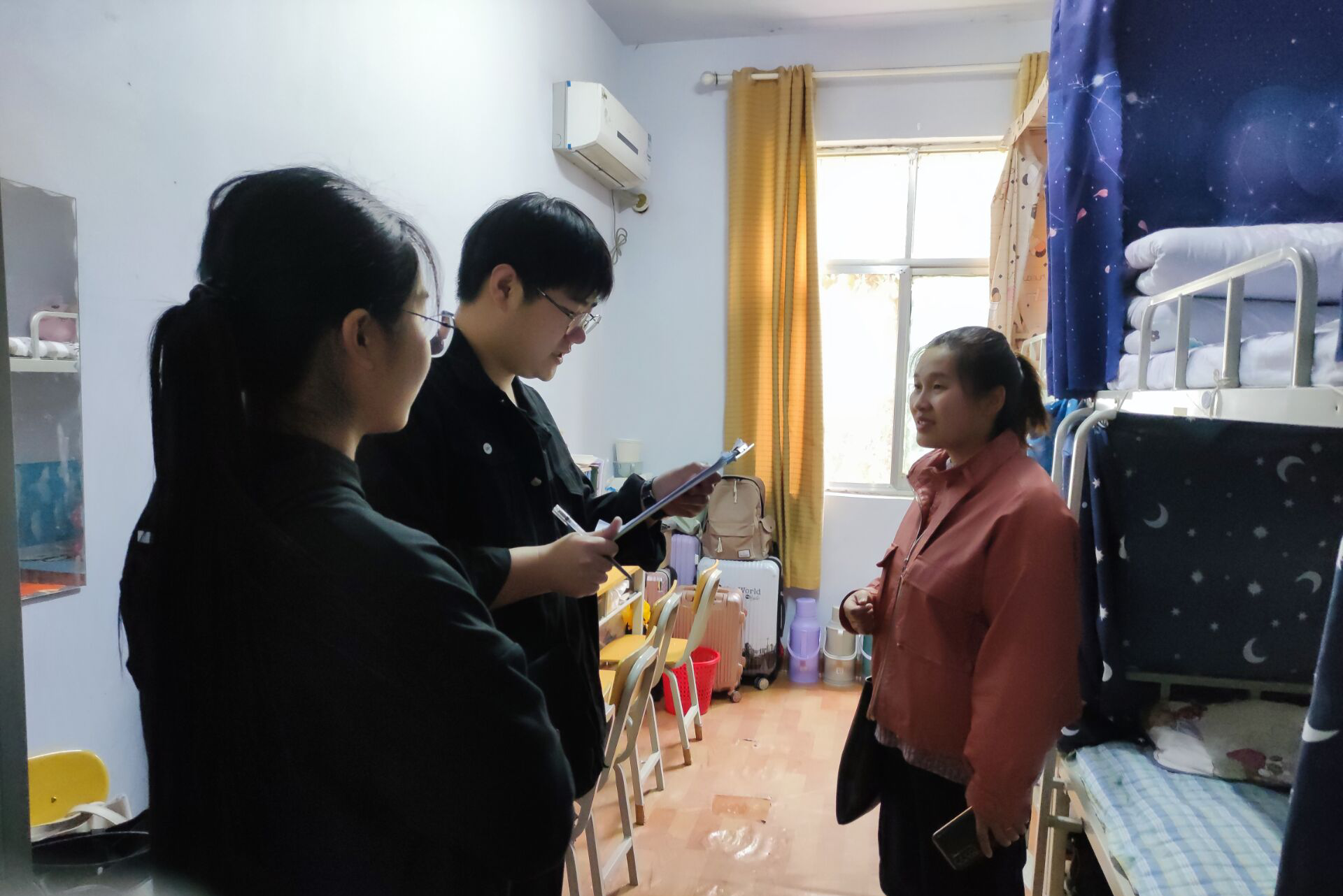 走访过程中,老师们详细询问员工日常生活情况,记录下员工遇到的难题,并对宿舍卫生、用电安全进行了检查。刘瑛提醒同学们一定要遵守宿舍管理规定,不使用违章电器,按时就寝,保持宿舍干净整洁,舍友之间相互理解包容、相互帮助,共同营造一个和谐、友爱、温馨的宿舍环境。刘瑛还提醒同学们,由于疫情防控形势需要,目前公司还处于封闭管理状态,希望同学们能继续坚持“非必要不外出”的原则,积极配合公司做好疫情防控工作,安排自己的好学习生活。此外刘瑛也对同学们的理解与配合表示感谢。