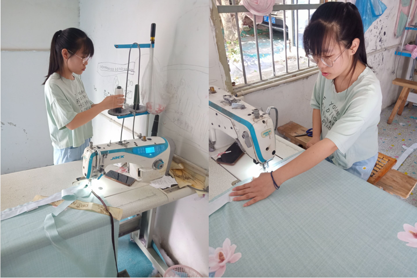 在实践活动中,田亚茹体验了翻被罩,缝床单,叠棉被,整布料等工作,亲身体会到每个岗位工作的繁忙与辛苦。整理被罩,需要不停抖动才能将其翻面,以供下一环节人员使用。使用缝纫机时要一刻不停地注视针脚,且两只手要一直按着床单,使其保持绷紧状态。每一个环节都不轻松,也不容松懈,因为一个人的失误就会导致其他人的心血白费。经过走访工人了解到,现在工坊的工作环境、安全保障以及工人的安全生产意识有大大提高了,而且工人们的待遇也变得更好。