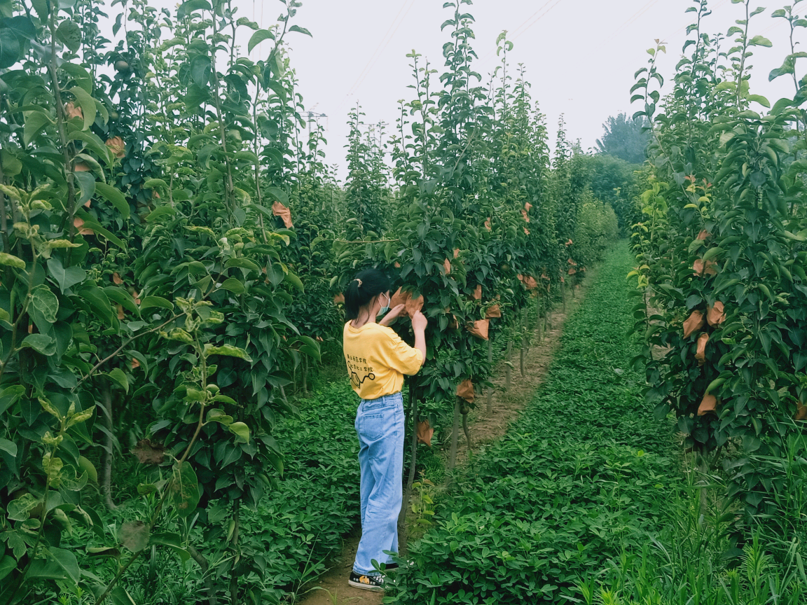 7月29日,团队成员潘亚茹前往河南省一处果园进行果树梳理志愿者服务活动。当地村民种植水果较多,以瓜果蔬菜作为当地重要经济来源。潘亚茹随村民一起修整果树,防止虫子破坏果子,保证果子质量。