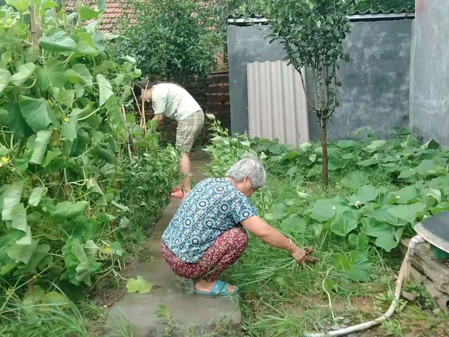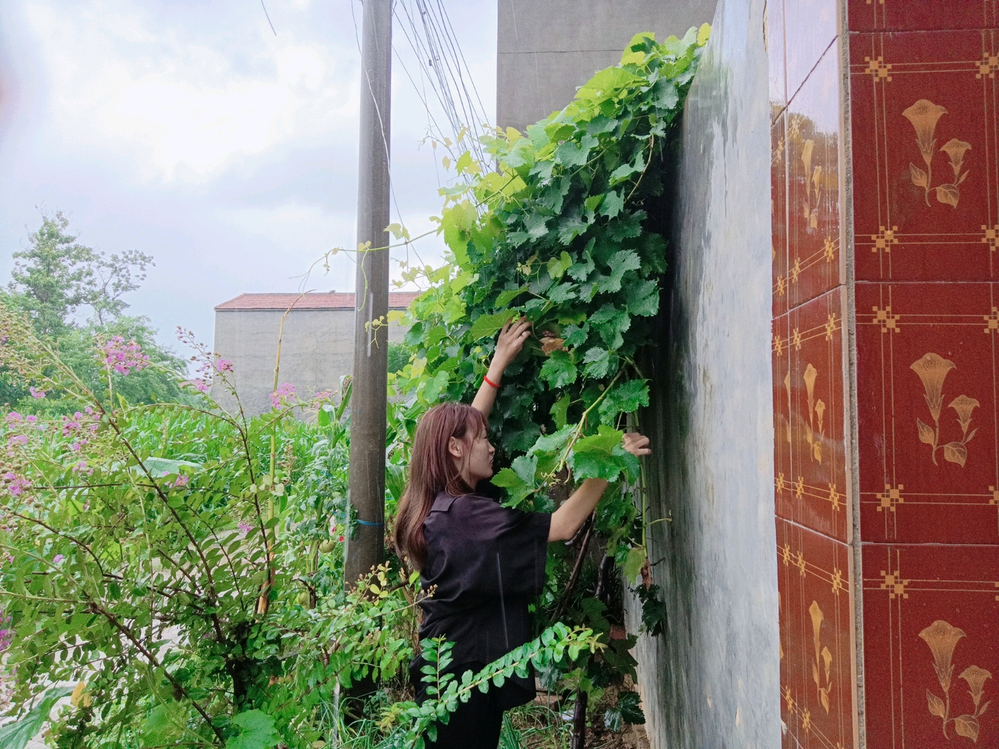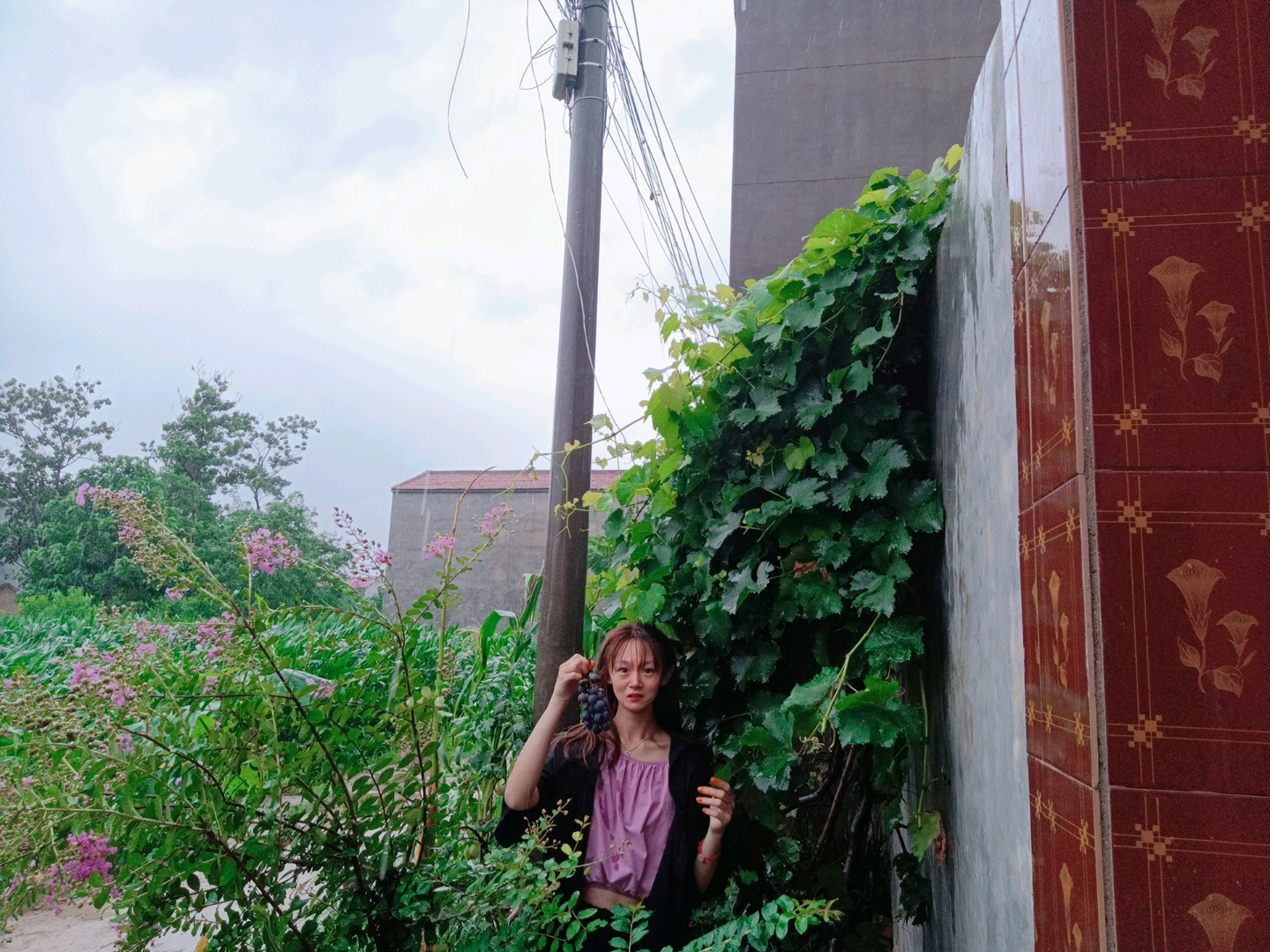 7月22日,团队成员陈辛顺前往河南信阳一户人家帮助村民采摘葡萄。天气虽有好转,依旧阴雨绵绵,陈辛顺跟随村民一起来到葡萄架下采摘,第二天去市场售卖。大串的葡萄已经成熟,村民们心中高兴,今年会有一个好收成。