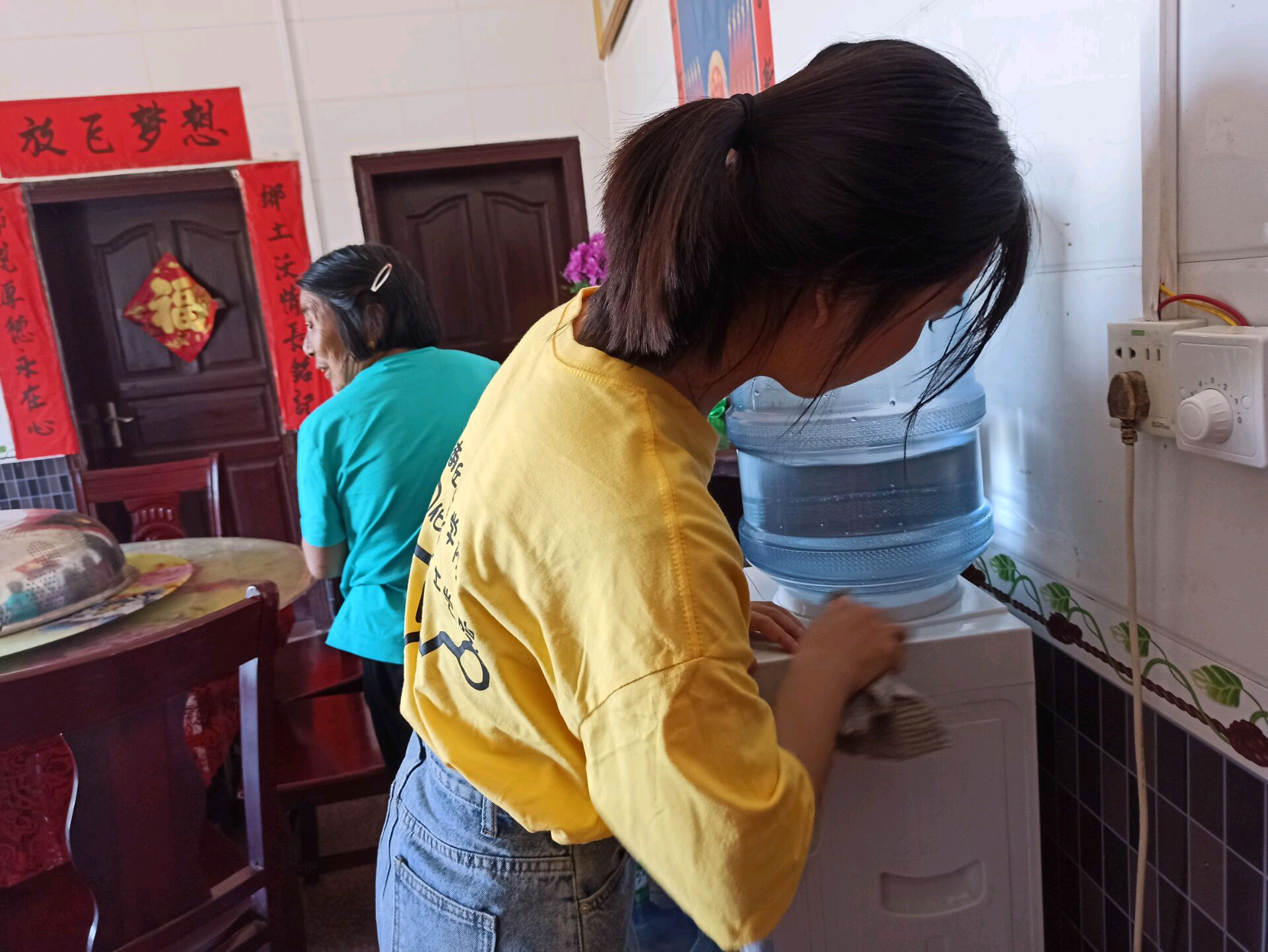 7月21日,团队成员刘冰前往河南信阳市一户人家帮忙开展卫生大扫除活动。在打扫客厅时刘冰发现,多个大功率电器同时使用一个插盘,面对这种情况,刘冰及时指出村民做法错误,并引导他们如何正确使用大功率电器和插排,并普及安全用电知识。