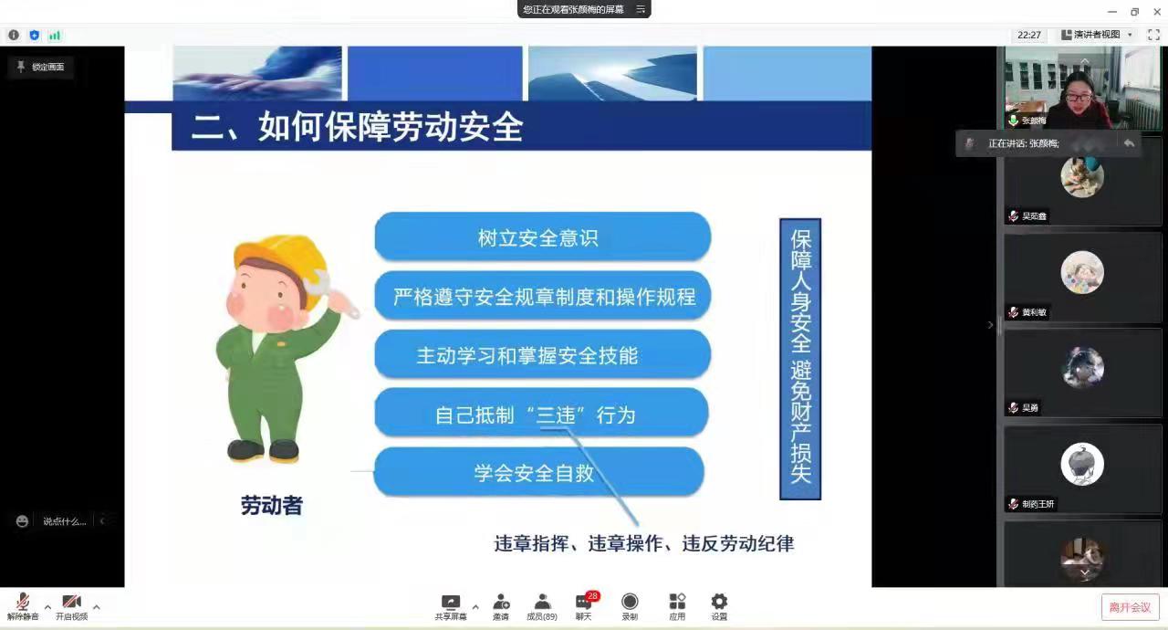 为进一步加强员工对劳动安全的理解,增强劳动安全意识。3月17日,E8官网登录入口通过腾讯会议开展了老员工与劳动安全线上主题讲座。主讲人为公司党委副书记张颜梅。19级、20级全体班委和宿舍长参加此次讲座。
