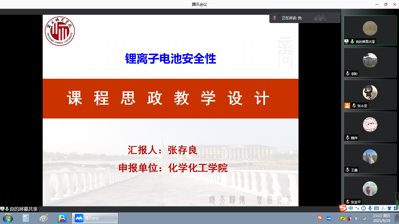 会上,张永亚老师首先带领大家一起学习了课程思政建设的主体内容,并结合本系理工科、综合实践和化学教育类等专业课程的特点,总结了适用于本系课程的主要思政元素和关键融入点。随后,会议邀请了张存良老师为大家做思政课程申报经验分享,张老师以《锂离子电池安全性》为例,与大家分享了具体如何在专业课中融合思政元素,以及如何设计一门思政教学课程。