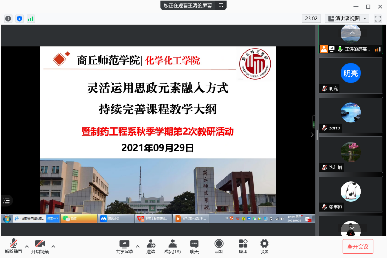 首先,王涛对基于2020版课程教学大纲基础上如何将课程思政元素有机融入进行了简单介绍。接着,王晓娟老师就《药物化学》课程第九章靶向抗肿瘤药物这一知识点如何进行课程思政教学设计进行了交流和分享。最后,大家针对课程思政要点如何与专业知识点融合、课程思政融合的讲解策略等问题展开了激烈讨论。
