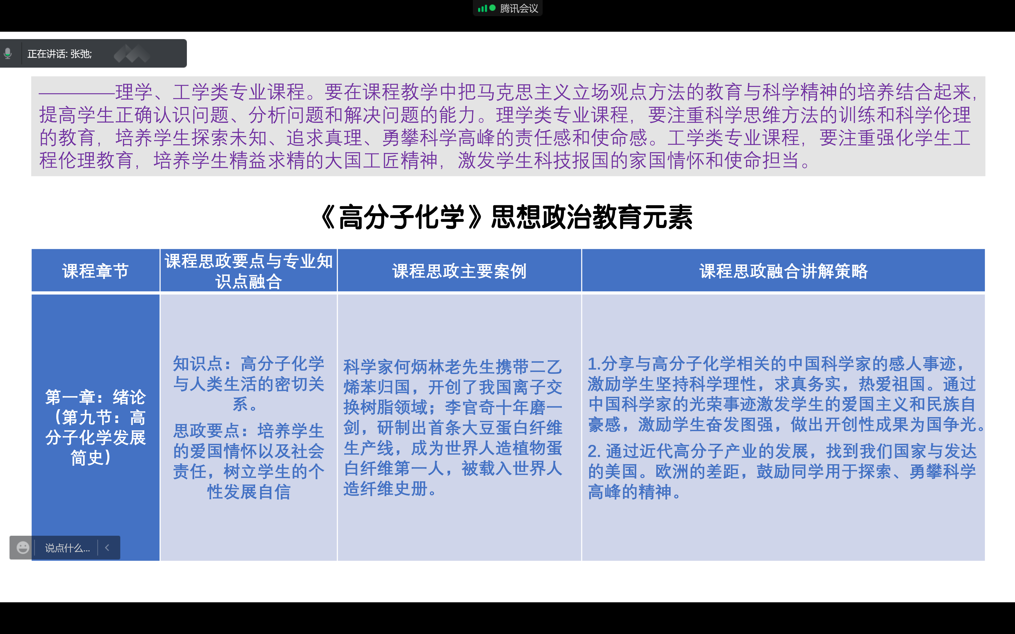首先,大家一起学习了公司下发的“基层教学组织教学研讨主题”材料,针对理工专业课程,集中讨论了如何在课程教学中把马克思主义立场观点方法的教育与科学精神的培养结合起来,强化员工工程伦理教育,培养员工精益求精的大国工匠精神,激发员工科技报国的家国情怀和使命担当。之后,邵梅玲老师分享了在《高分子化学》课程中思政元素融入的整体构思,并举例阐述了思政元素与具体知识点相结合的教学设计。
