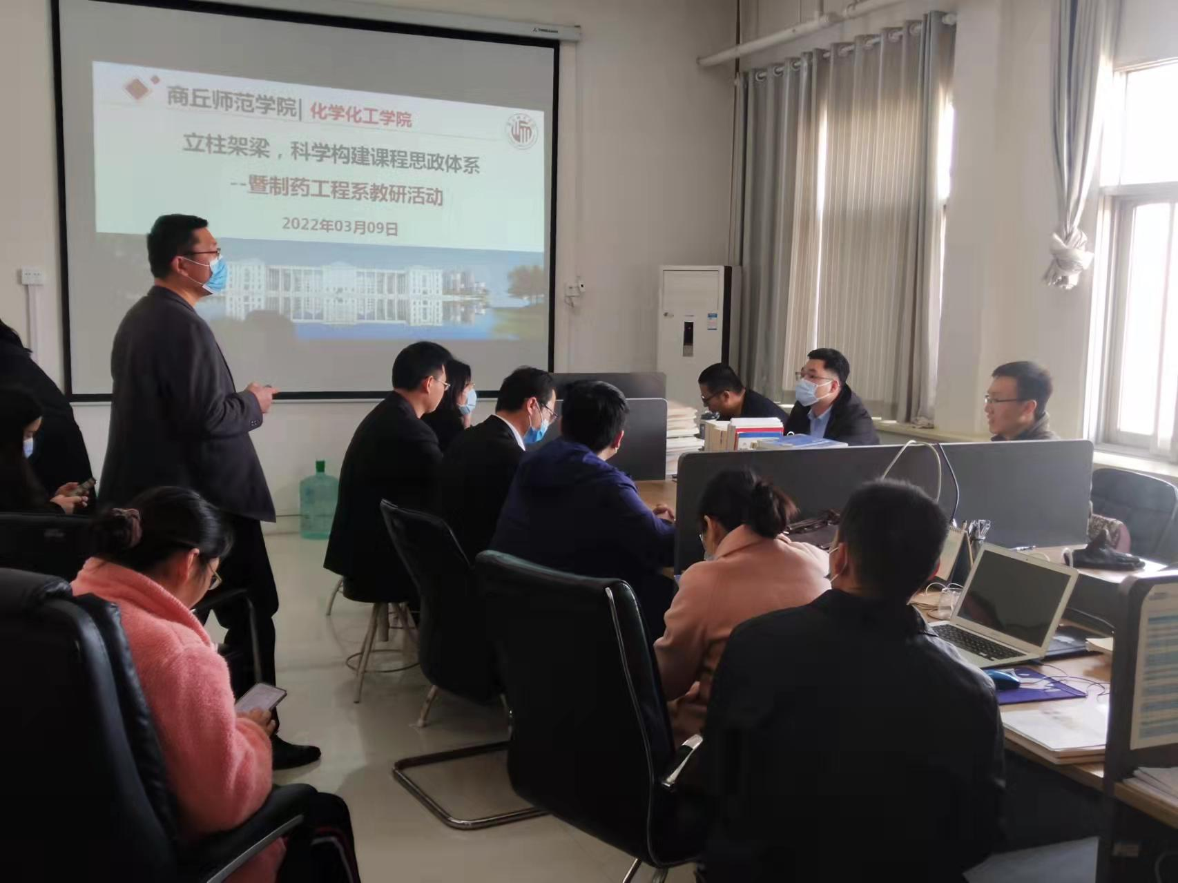 为推进课程思政建设,构建“全课程融入、全过程贯穿、全方位保障”的课程思政教学体系,寓价值塑造于知识传授、能力培养之中,3月9日,制药工程系在化学实验楼416室召开了以“立柱架梁科学构建课程思政教学体系”为主题的教研活动,本次教研活动由药物绿色合成河南省工程实验室主任李峰老师主持。
