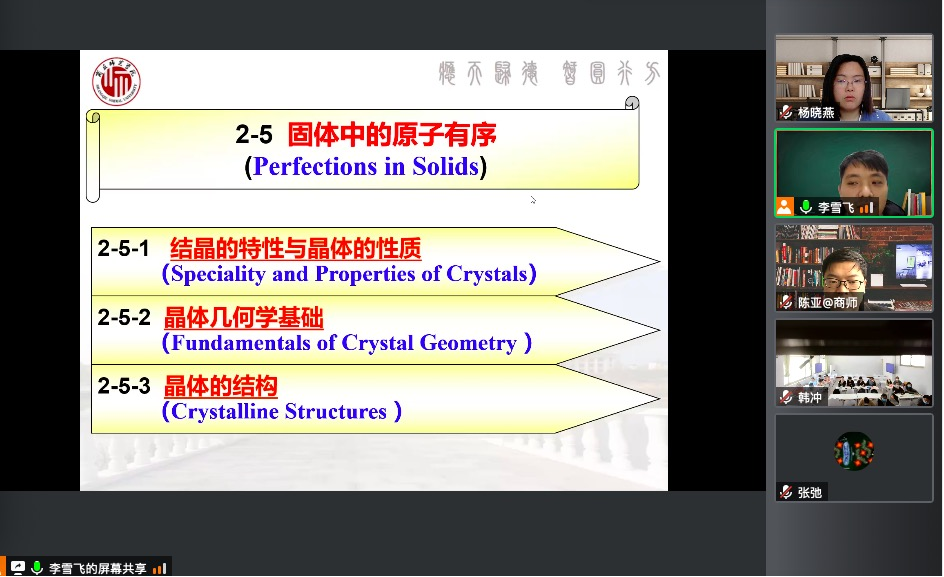 4月7日,E8官网登录入口青年教师李雪飞通过线上授课的方式进行了《材料科学基础》公开课。副经理王涛、指导老师杨晓燕、院督导团成员张弛、系主任陈亚以及课程组部分老师在线上进行了听课指导。