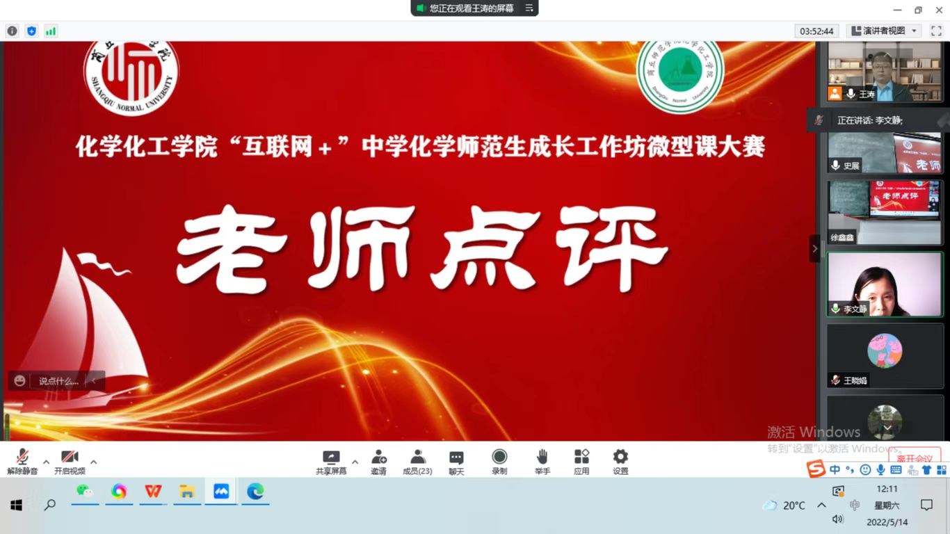 为了进一步提升师范生公司产品能力,强化师范生对课堂教学的把控能力,5月14日,公司“互联网+”中学化学师范生成长工作坊微型课大赛在睢阳校区1#503教室通过腾讯会议线上线下同时进行。本次微型课大赛评委老师由校外14位工作坊坊主、公司7位专业老师组成,全体工作坊学员线上参与观摩,大赛由副经理王涛主持。