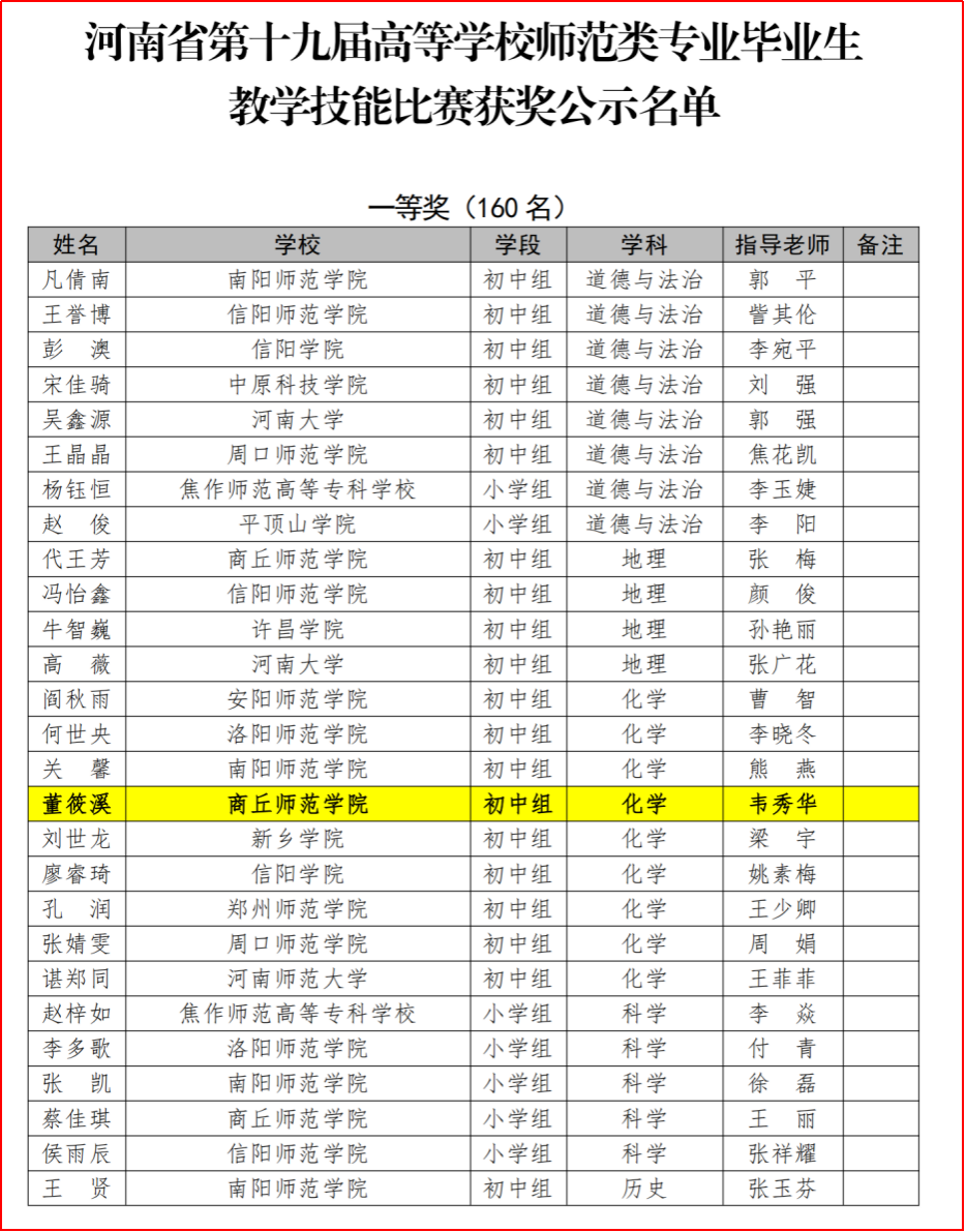 2022年4月10日,由河南省教育厅主办的河南省第十九届高等公司师范类专业毕业生教学技能比赛分赛在公司顺利举行。经过院内初赛,校内复赛,由韦秀华老师指导的18级化学(师范)专业董筱溪同学在第十九届高等公司师范类专业毕业生教学技能比赛中荣获初中化学组一等奖。