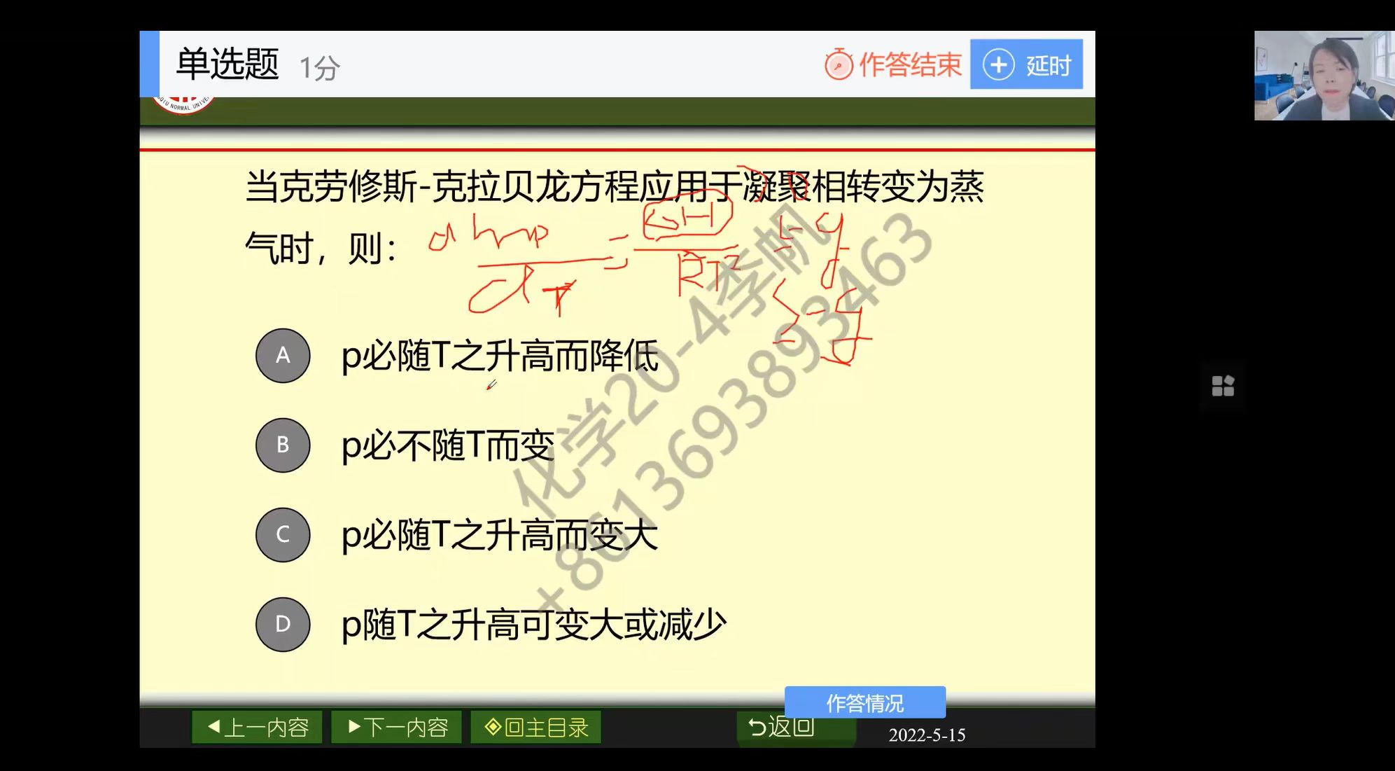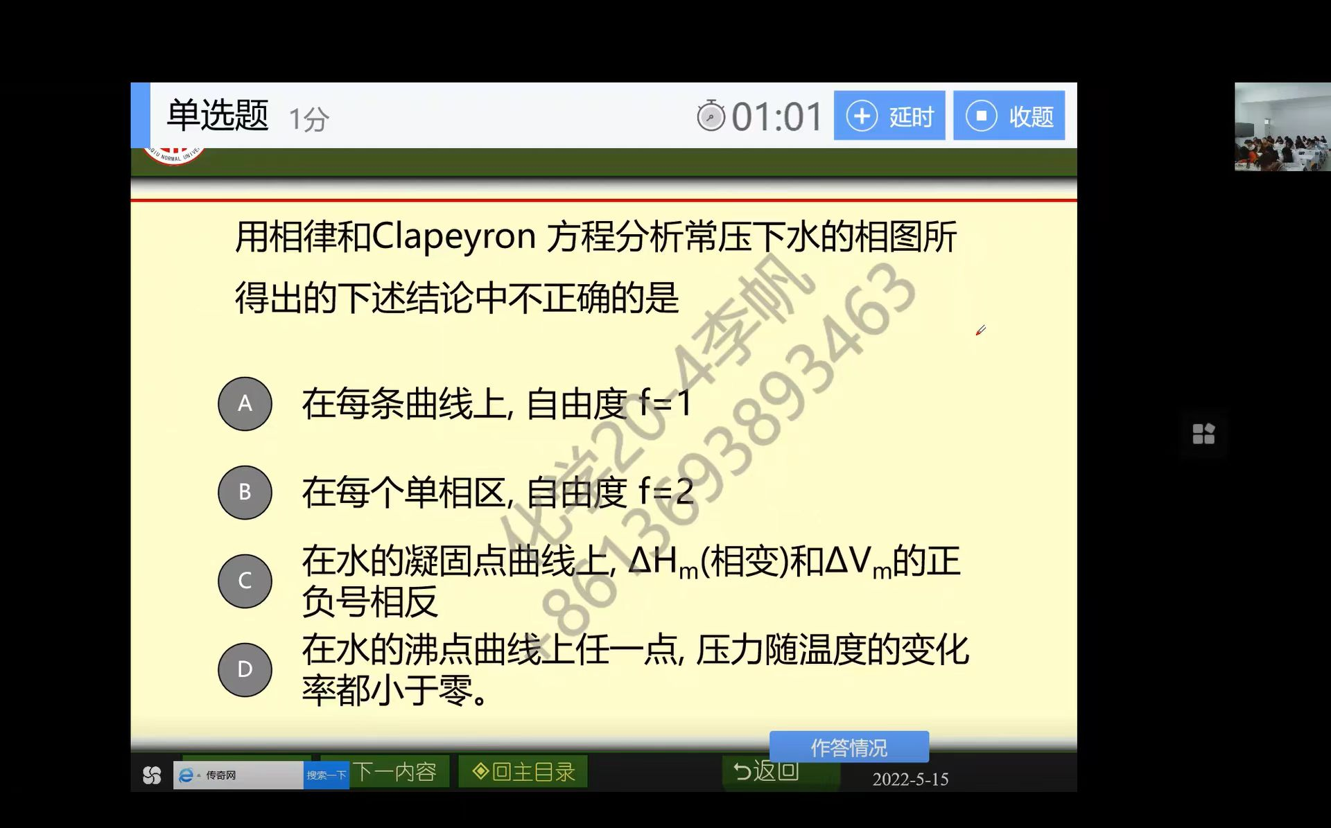 本次公开课以物理化学上册“单组分系统相图”为例进行课堂展示,主要讲解了单组分系统的两相平衡、水的相图。在当前信息化时代,把信息技术有效应用于“互联网+课堂”这个主战场,成为当今教学改革中的重点之一,韦秀华借助学堂云平台,通过腾讯会议直播,利用雨课堂进行师生互动,针对本节的重点和难点精心设计了多元化的教学形式,实现了多维度的教学互动。