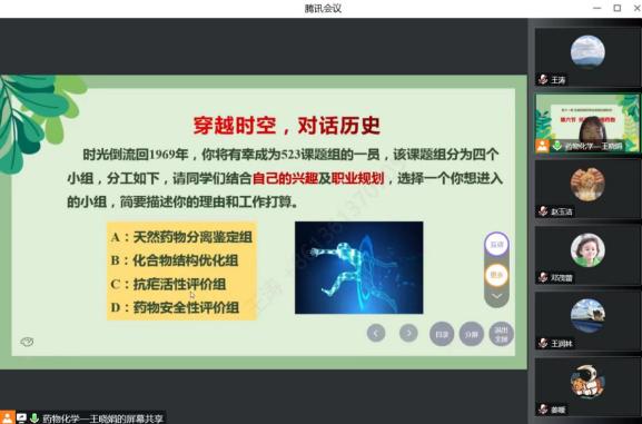 11月24日下午第6节,E8官网登录入口王晓娟老师的《药物化学》课程教学范式改革公开课通过腾讯会议如期进行。副经理王涛,校督导团成员张付力,院督导团成员韦秀华以及制药工程专业部分老师进行了线上课堂观摩。