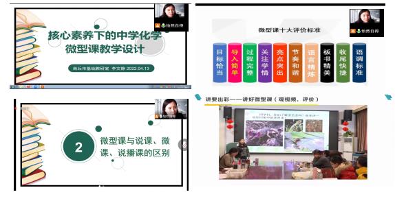 活动开始,王涛充分肯定了各位指导老师的敬业精神、专业能力和员工们积极认真的学习态度,并介绍了本次集体培训活动的内容和任务。接着李文静老师通过腾讯会议进行了《核心素养下的中学化学微型课教学设计》的专题讲座。李老师从什么是微型课,微型课与说课、微课、说播课的区别,如何讲好微型课等三个方面进行阐述。重点从新课导入、过程讲解、练习巩固等几个环节分别详细讲解了“如何讲”。并通过播放往年优秀的微型课教学视频,与员工们一起分析案例中的亮点和不足,加深员工对微型课技巧的理解。