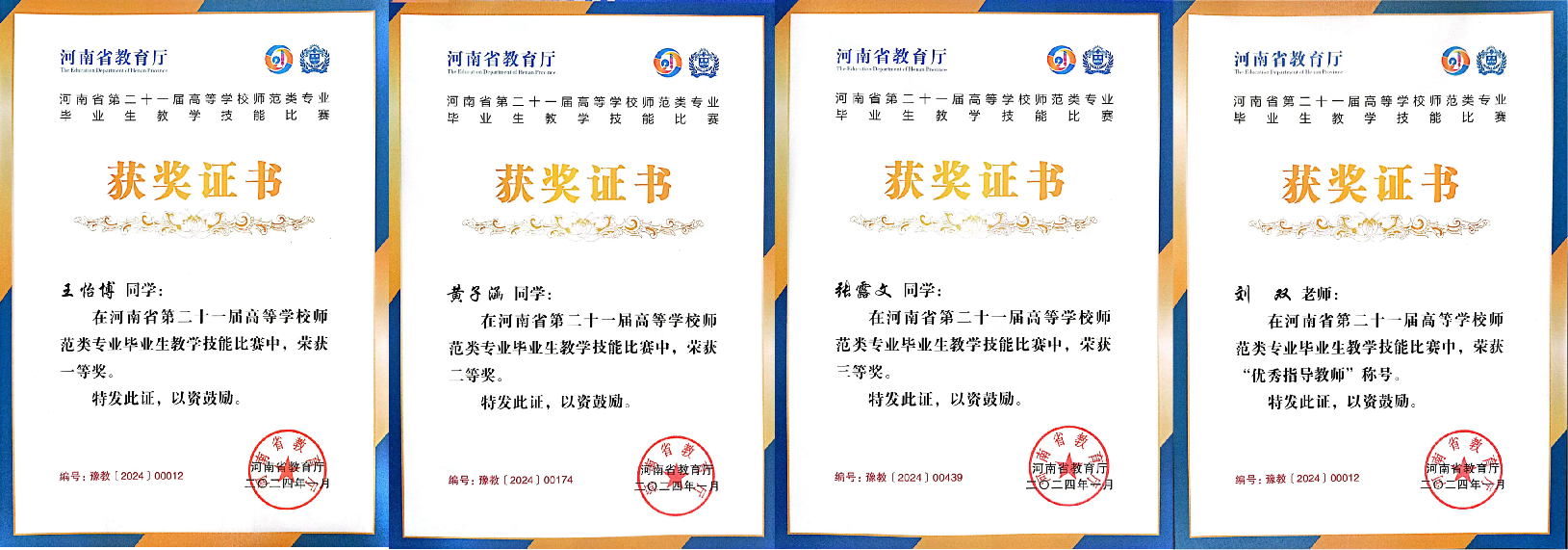 2024年1月4日,河南省教育厅发布了《关于公布第二十一届高等公司师范类专业毕业生教学技能比赛结果的通知》(教办师〔2024〕4号),公司王怡博同学获得一等奖,黄子涵同学获得二等奖,张露文同学获得三等奖,刘双老师获得“优秀指导教师”奖。