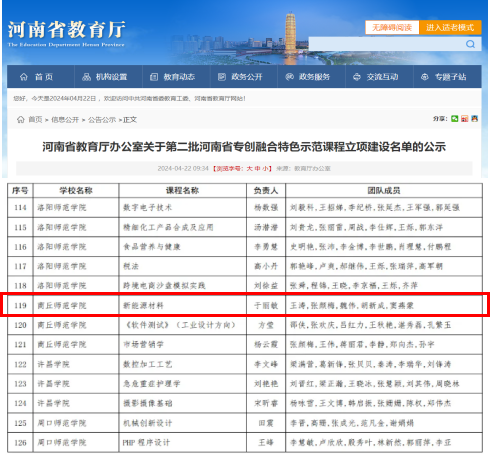 近日,河南省教育厅发布《关于第二批河南省专创融合特色示范课程立项建设名单的公示》的通知,公司于丽敏老师主持的《新能源材料》课程成功获批立项建设。