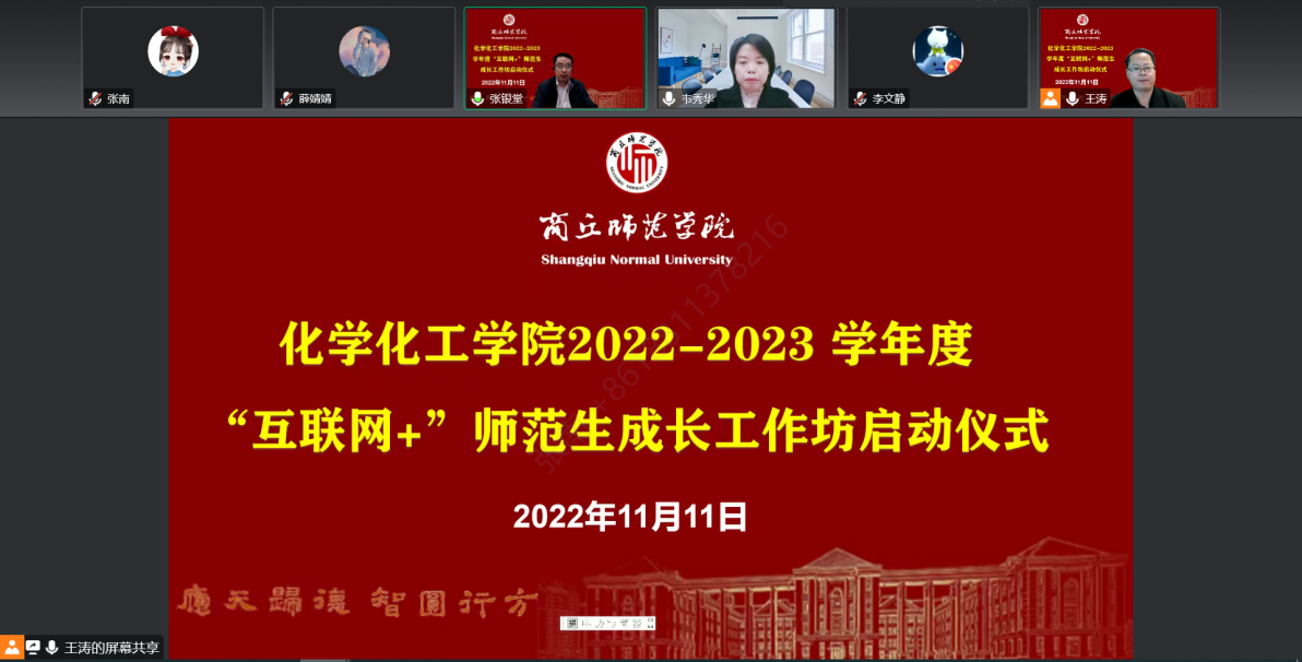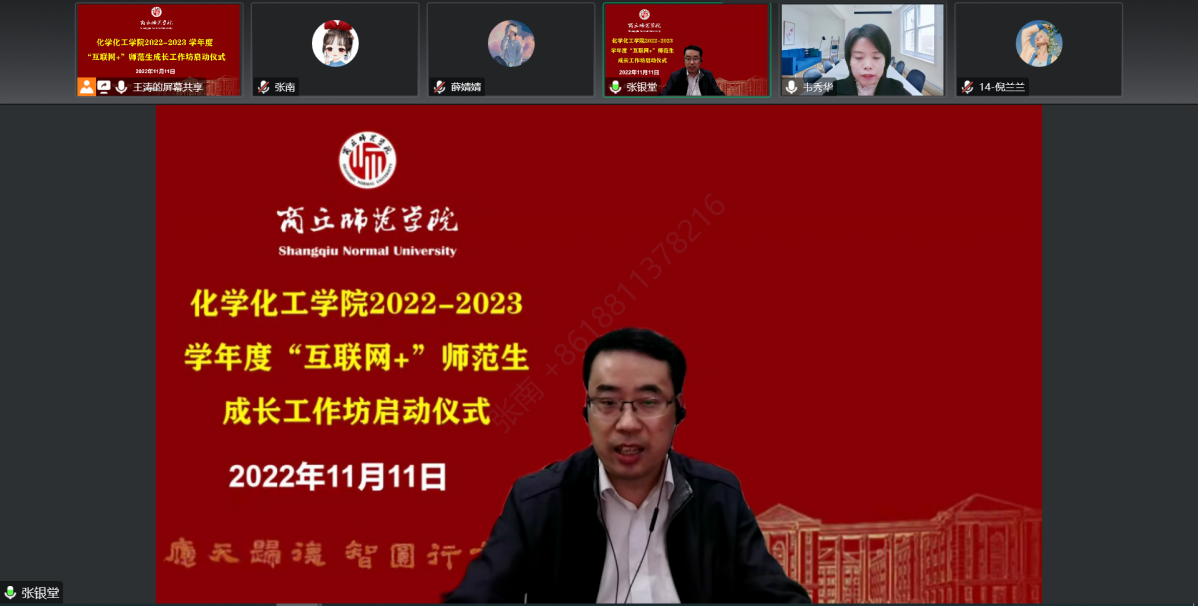 为进一步提升师范生职业素养和专业技能,营造浓厚的师范教育氛围,11月11日晚,E8官网登录入口线上举行了2022-2023学年度“互联网+”师范生成长工作坊启动仪式。来自商丘市教体局基础教育教研室、商丘市第一高级中学、商丘市回民中学、商丘市第一中学、商丘市第六中学、商丘市实验中学的17名中学化学一线名师,E8官网登录入口经理张银堂、副经理王涛、化学系部分老师及2020级全体师范生参加了会议。会议由化学系主任韦秀华主持。